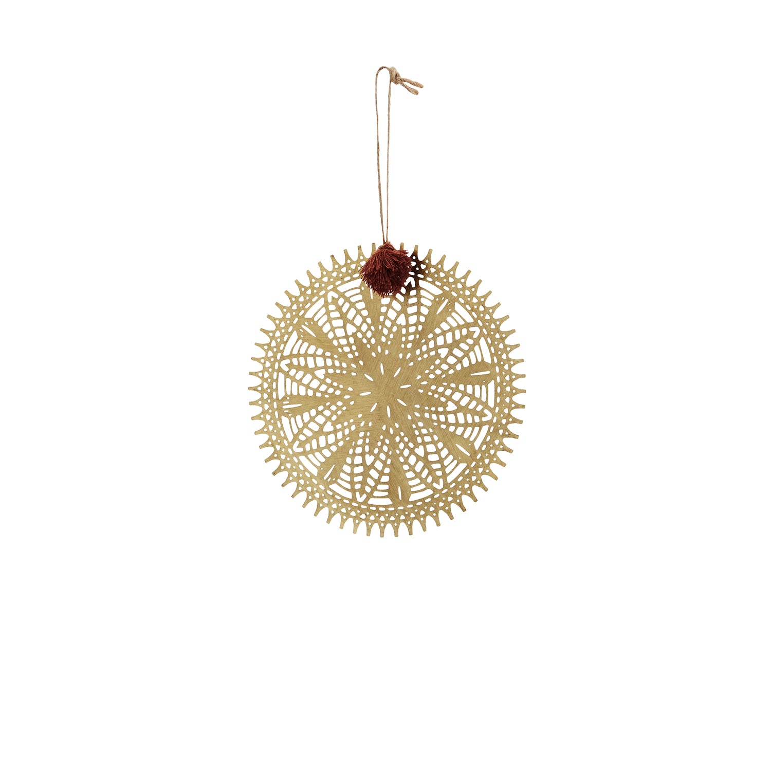 A beautiful decoration made from Iron with a gold finish. The hanging snowflake comes with string and tassel attached and can be hung up around the home as a festive decoration.