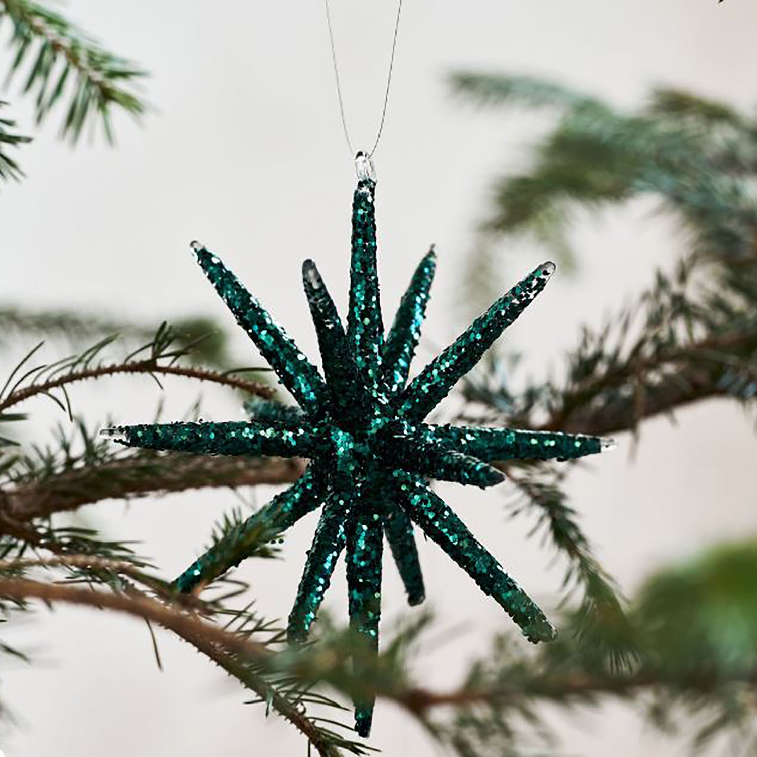 A classic Christmas colour and a contemporary look. This large ornament called Spike is made of glass covered in green glitter. Versatile, highly decorative and striking. Hang it in your living room window, make it a part of the table arrangement or place it in a decorative tray with other ornaments. Anything goes, as Christmas is about creating a personal atmosphere. Whether you balance the look with other materials or stick to classic colours, the result is festive and enchanting.