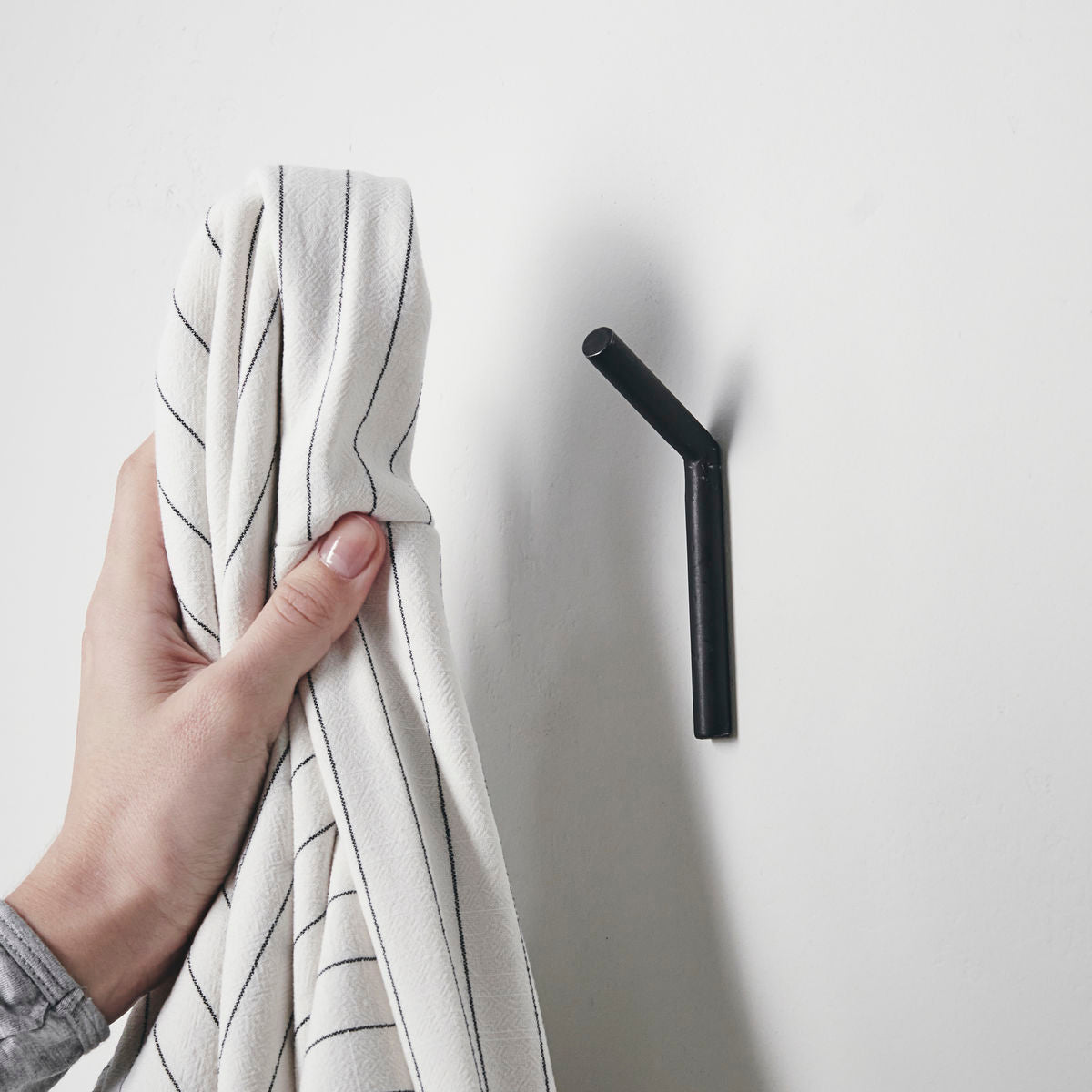 A simple, black hook which has a timeless and stripped back design. The hook is called Kyrkja and is made of iron. Mount one or more of them on your wall as a place to store hang garments, bags or whatever your need may be.
