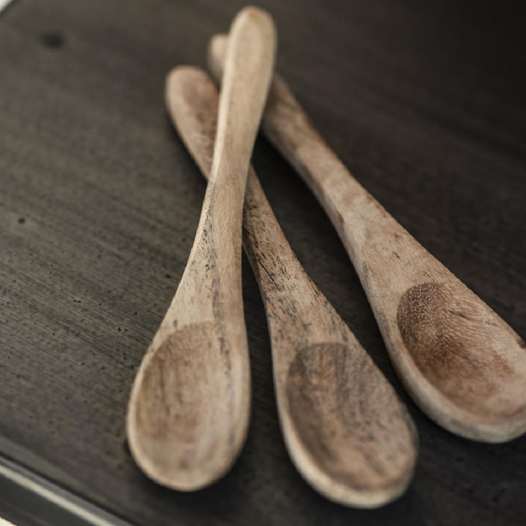 This rustic acacia wood spoon looks great as part of a table set to serve salt, pepper and other condiments with. Each spoon measures to 15cm in length and varies slightly in colour as is the nature of carved wood.