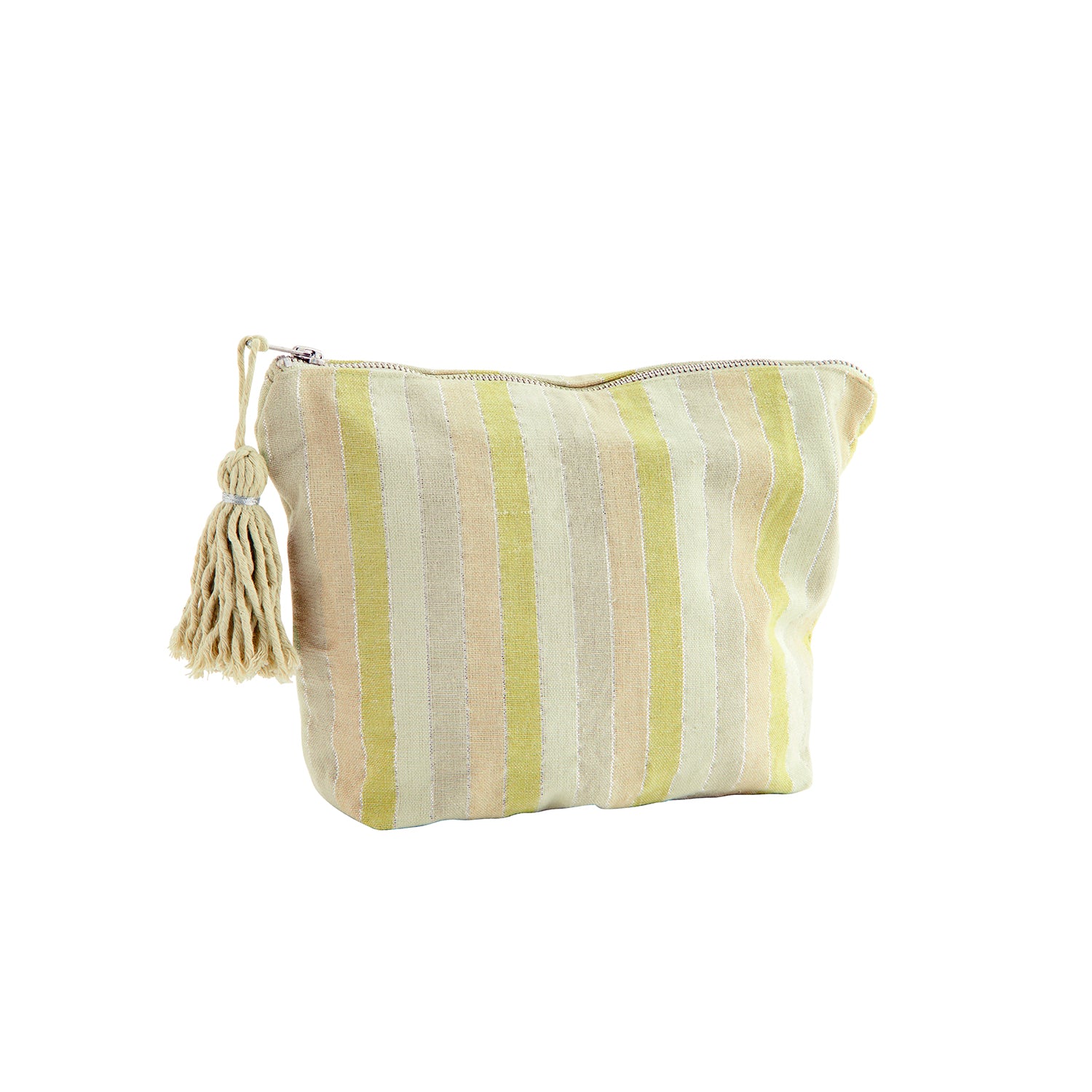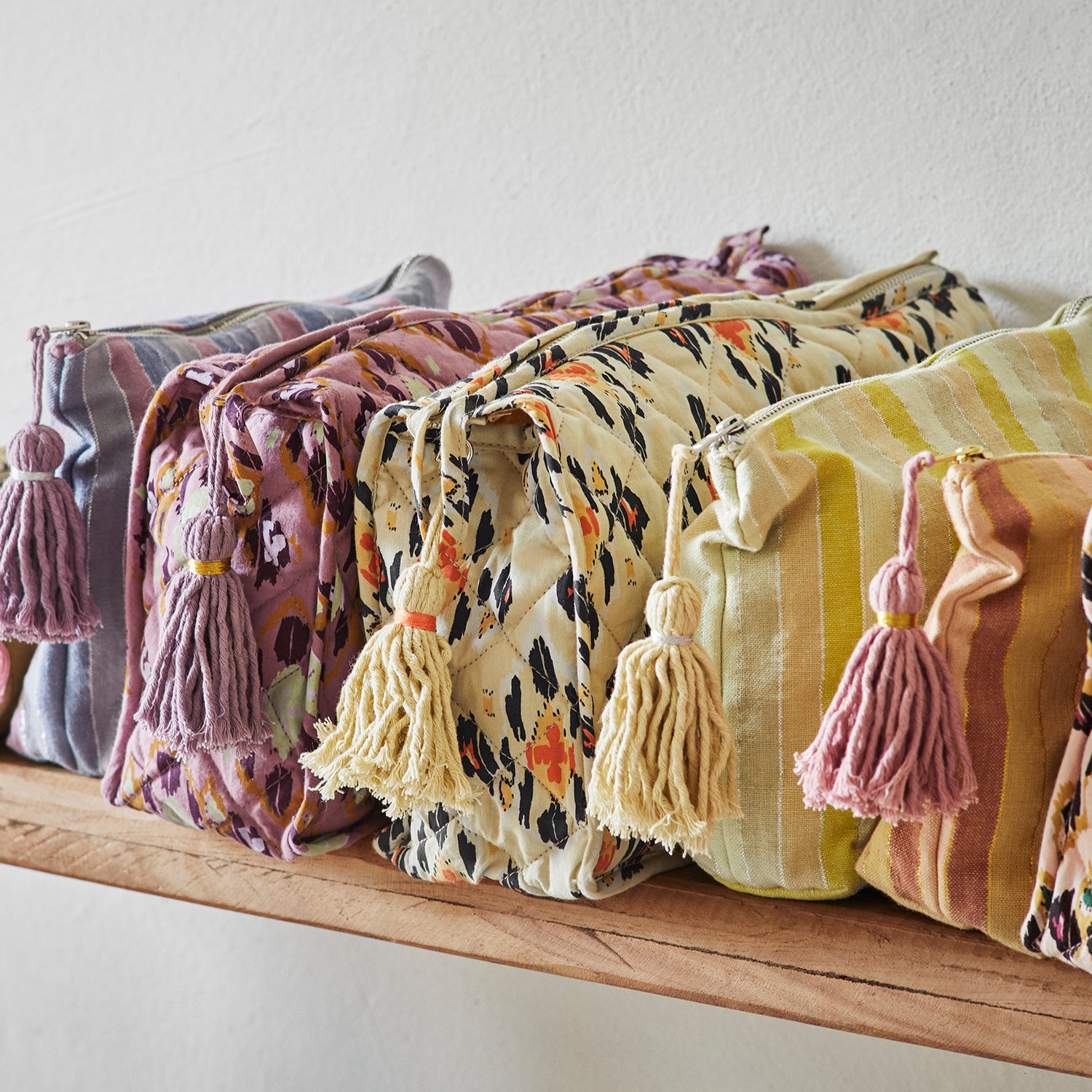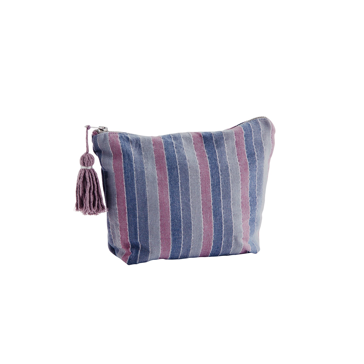Striped washbag adorned with a handmade tassel made from the women of Nai Disha's Empowerment Program in New Delhi.