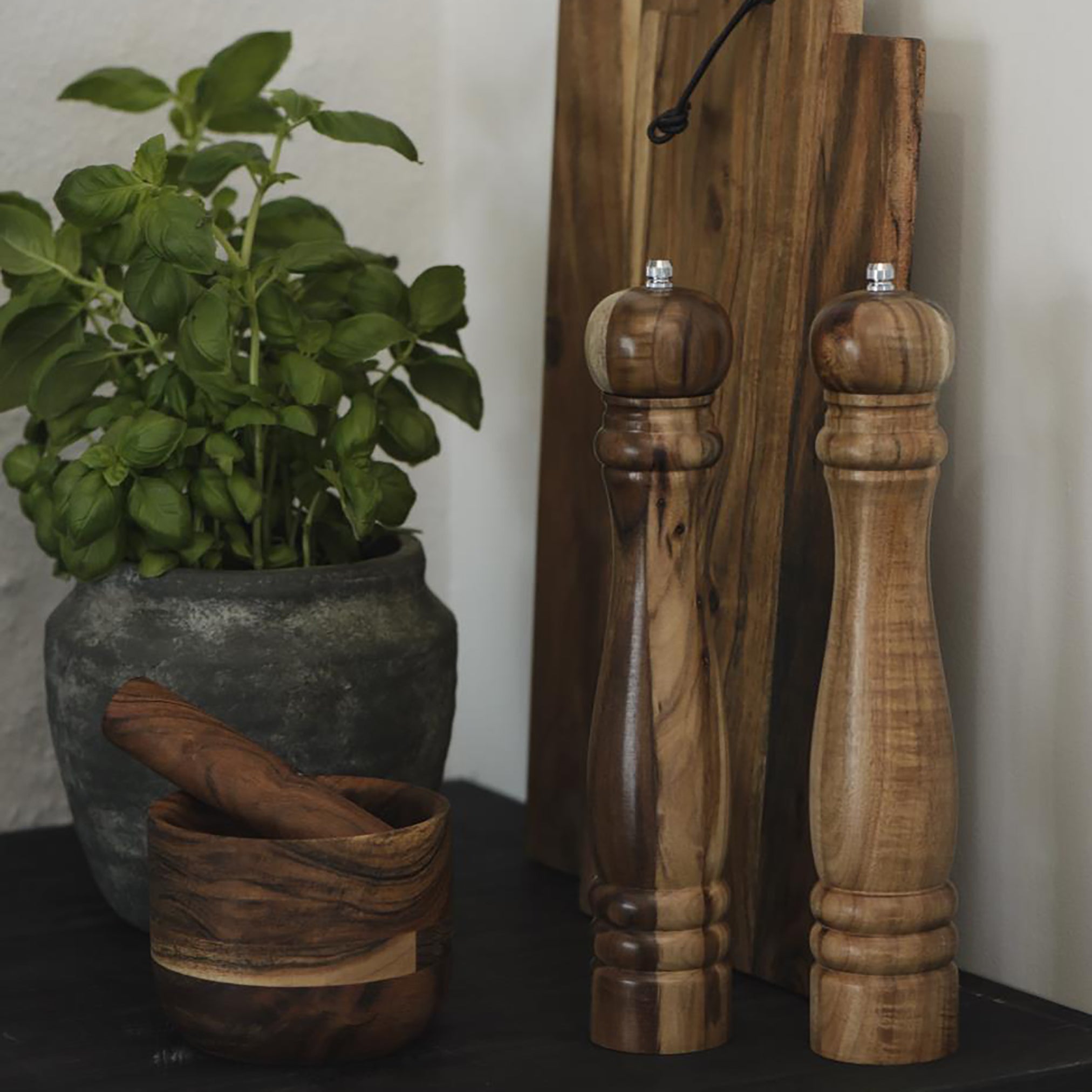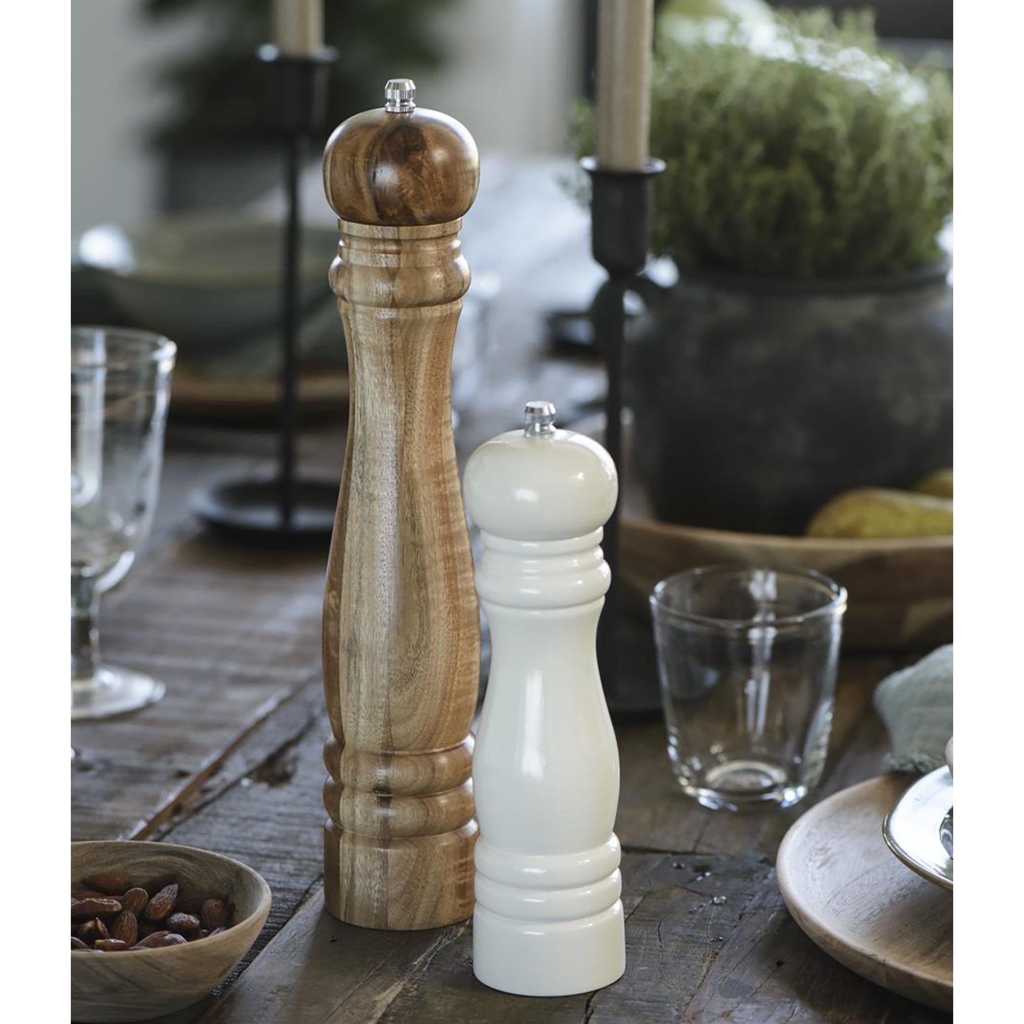 A wonderful, tall, wooden pepper or salt mill that would look good in any kitchen.