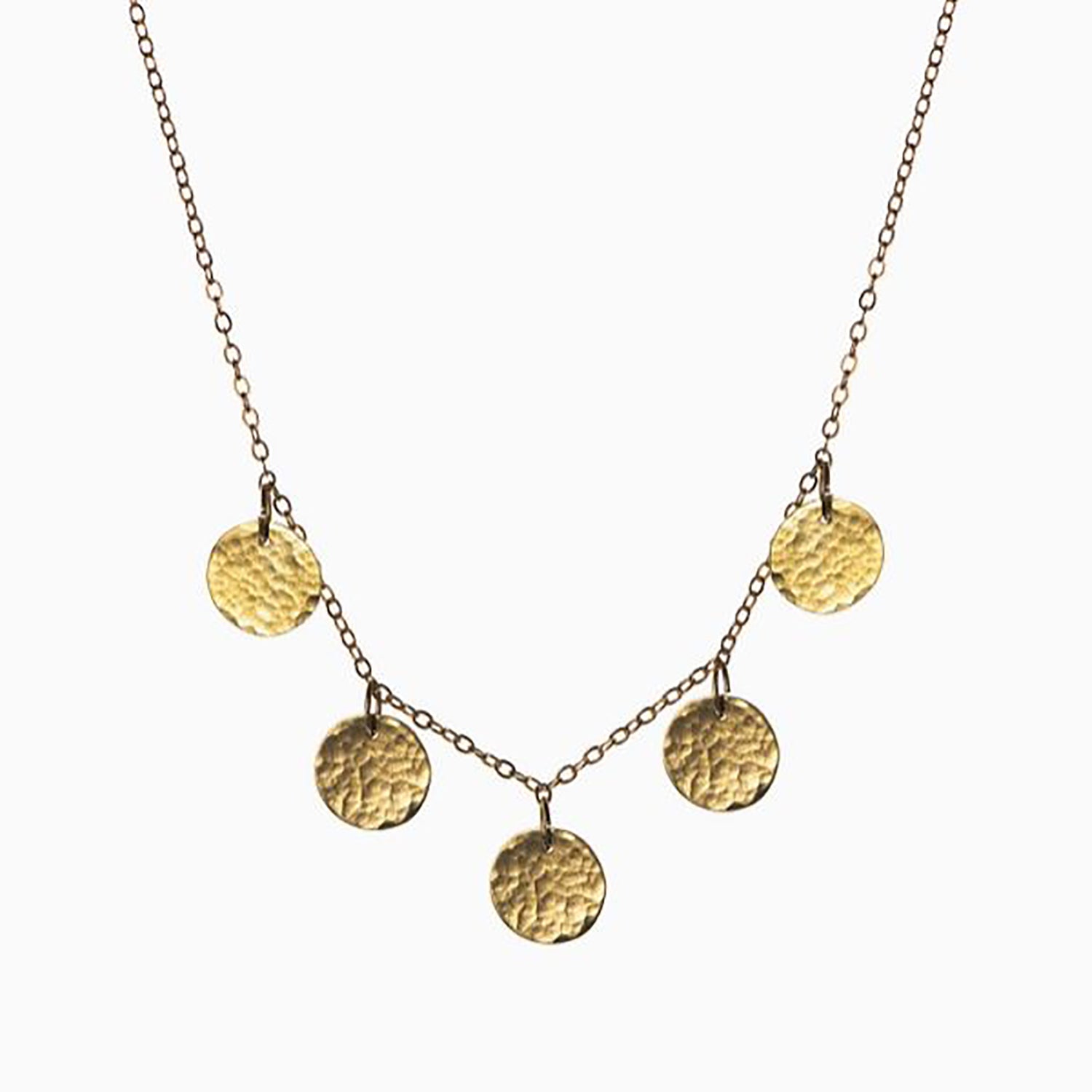 Hand cut from brass sheet and finished using a specialist hammer to give it texture, this necklace is made from brass with brass gold plated chain.