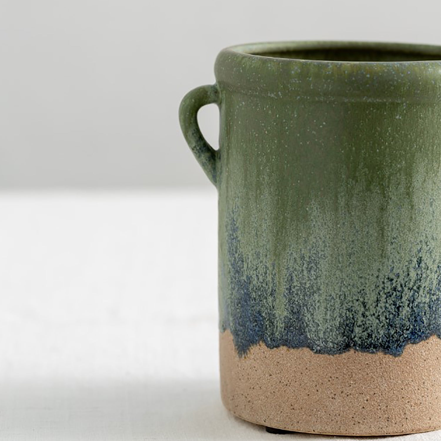 Ceramic Jar With Handles & Blue/Green Dipped Glaze