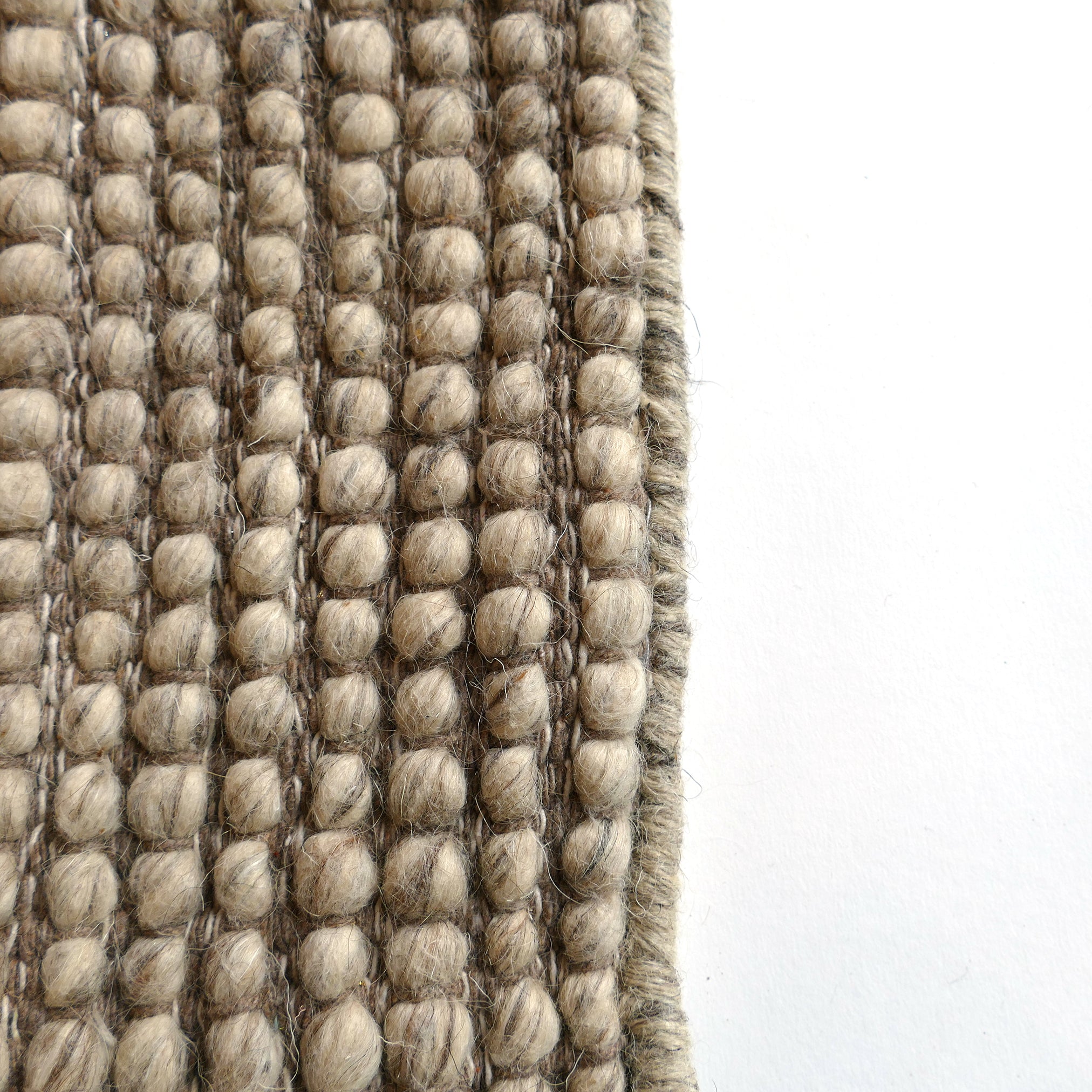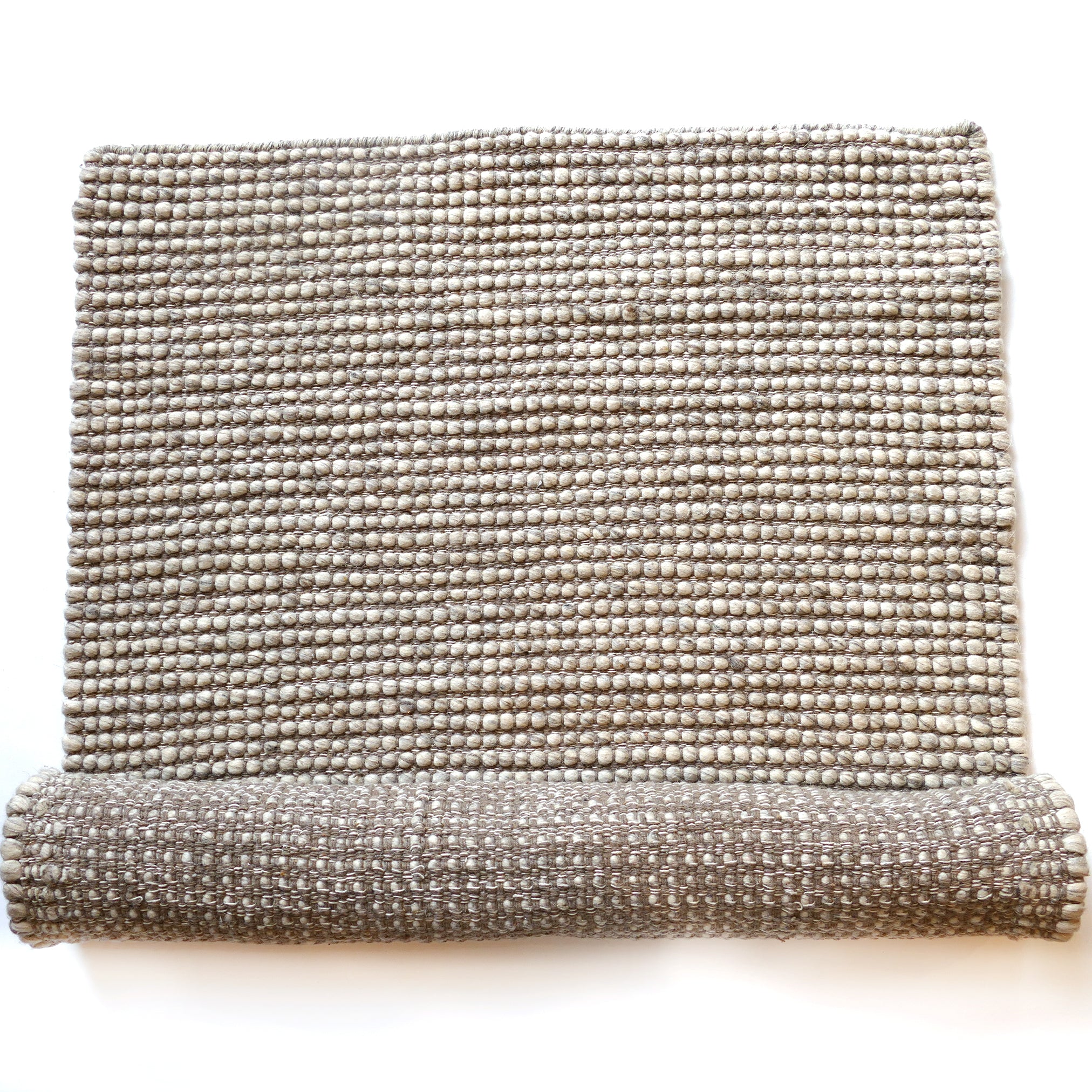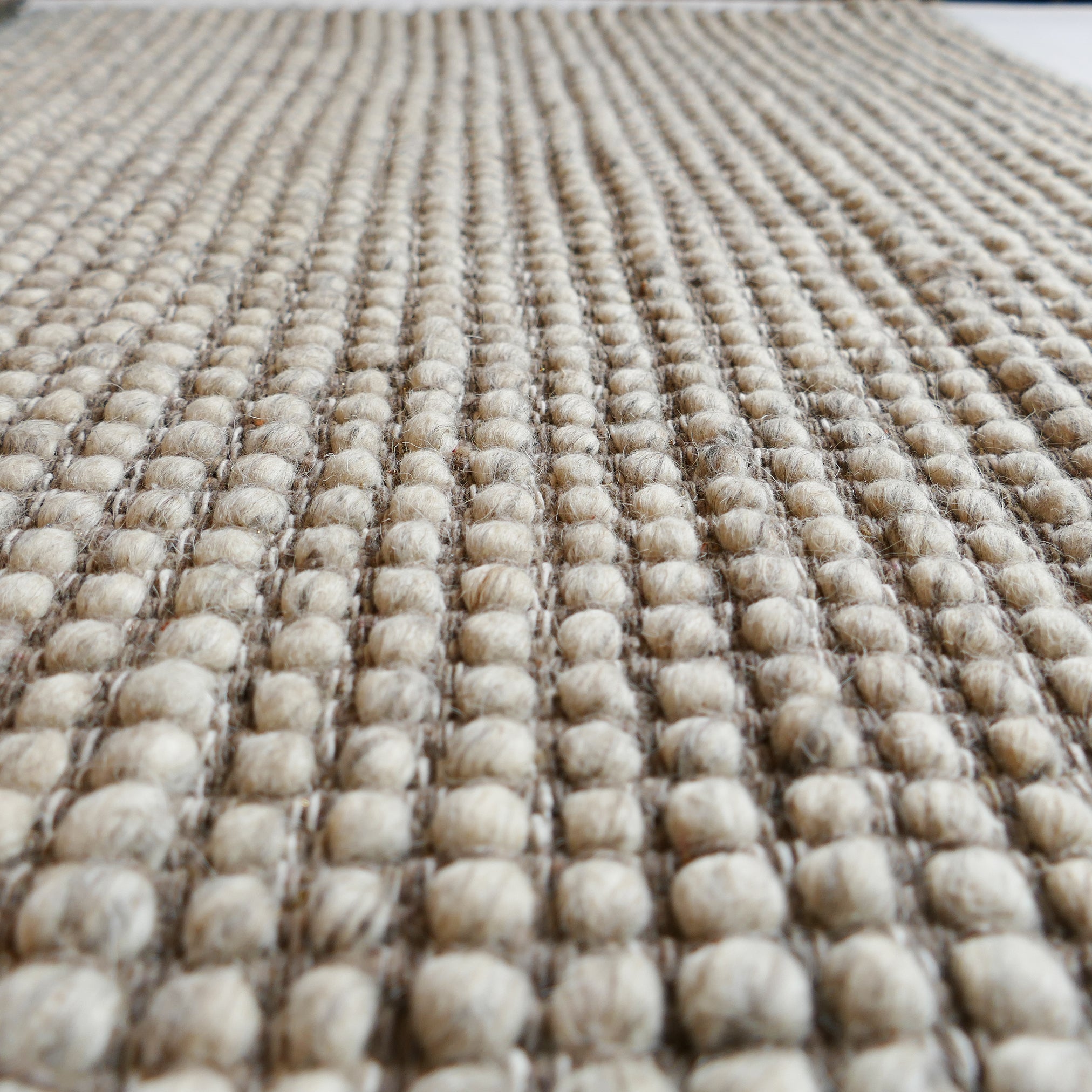 This wool rich rug has a thick weave. The tones of taupe and natural mixed yarns create a subtle and unique pattern on each chunky rug.