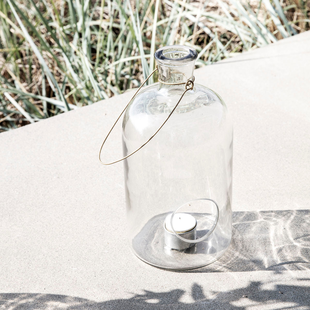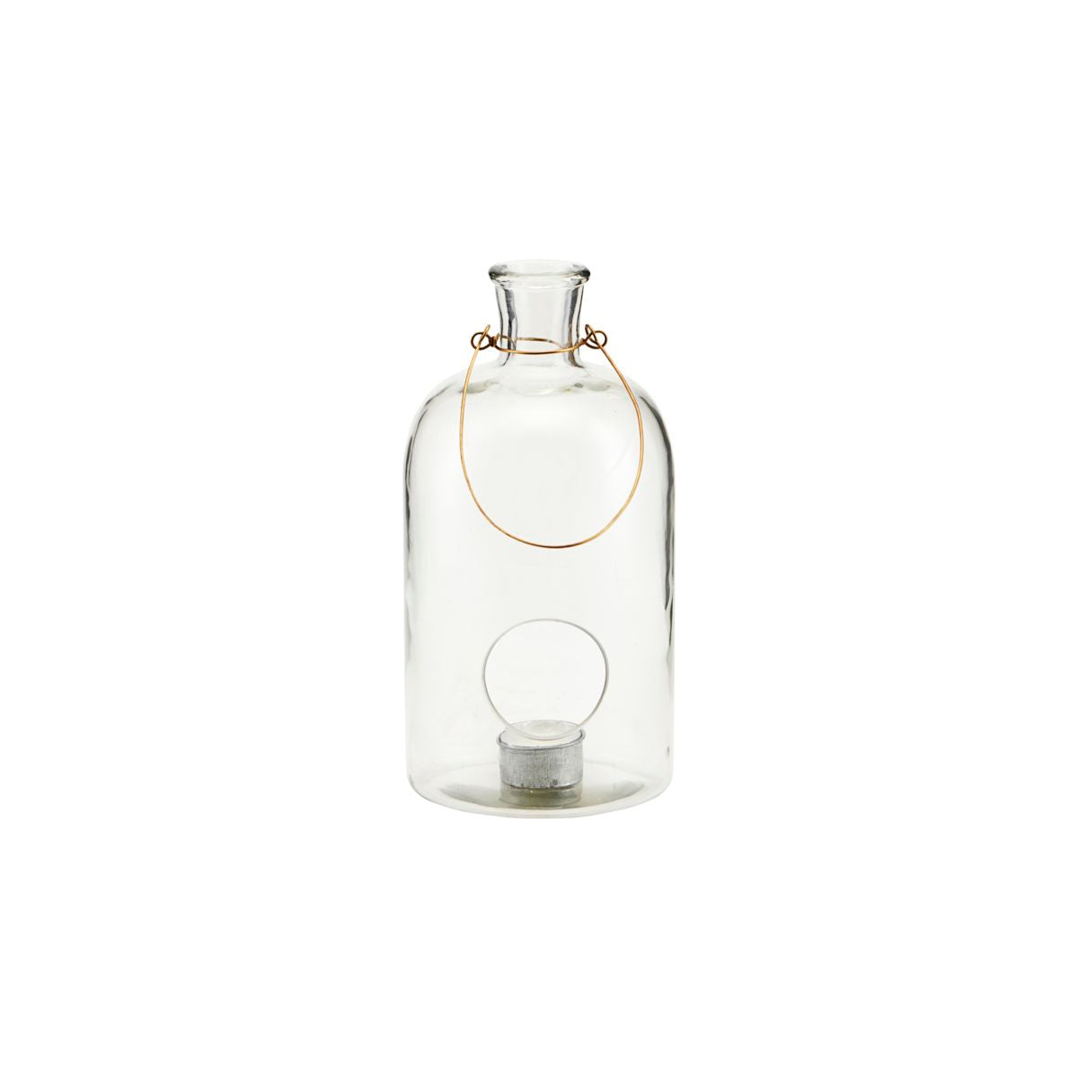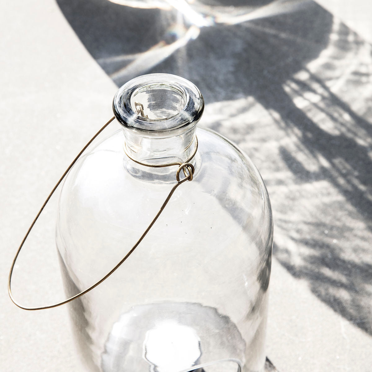 Create the perfect summer atmosphere with these beautiful lanterns from House Doctor. The lantern is called 'Frej' and measures 25 cm in height and 12 cm in diameter. The lantern is bottle-shaped and made of glass and metal, with a handle to hang it from, which is made of brass. Place a tea light in the lantern to create the perfect, cosy atmosphere.