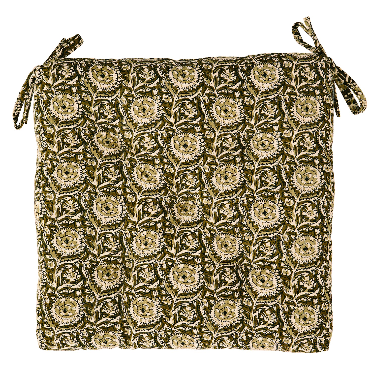 Moss, Celery green & Off white Floral Block Print Cotton Chair Pad