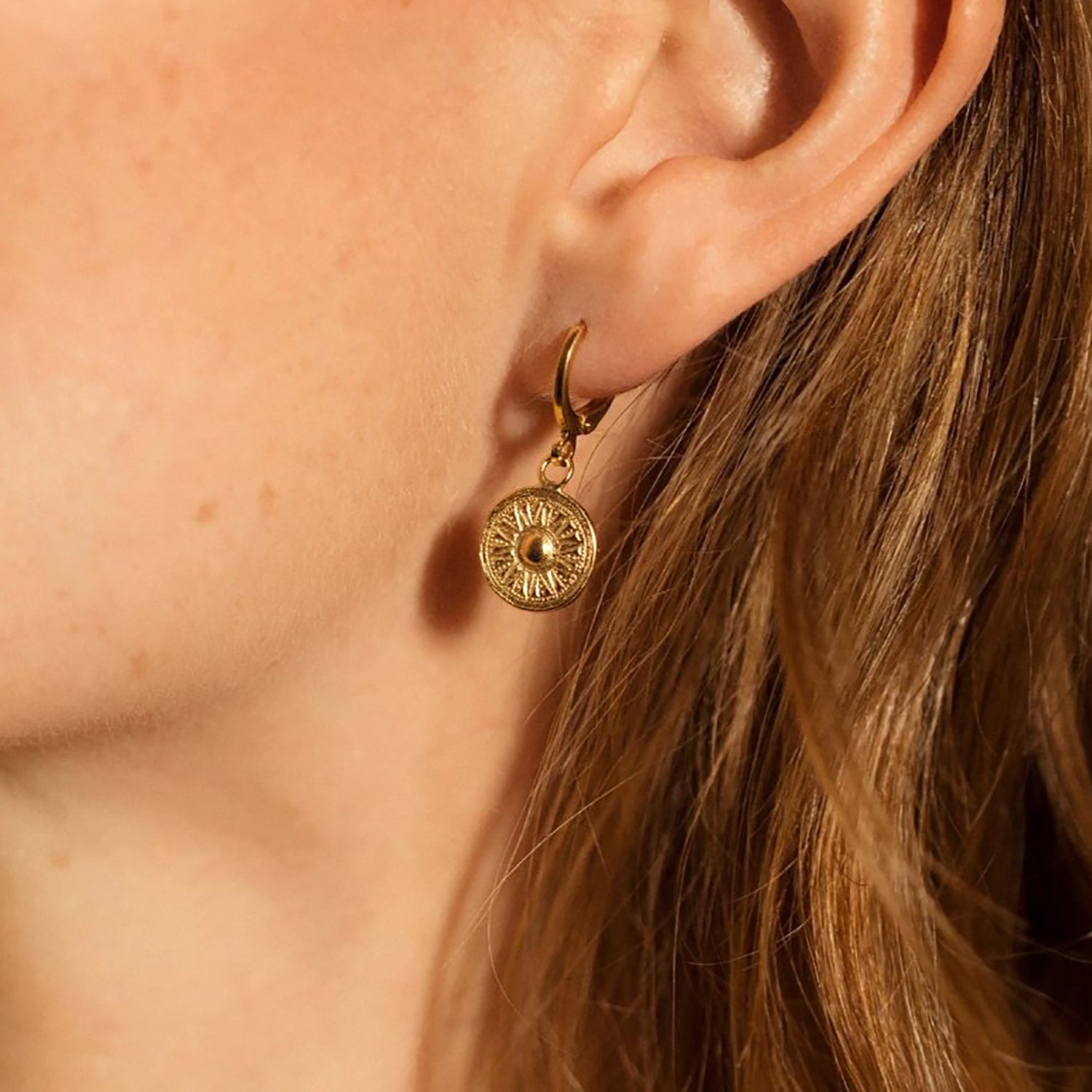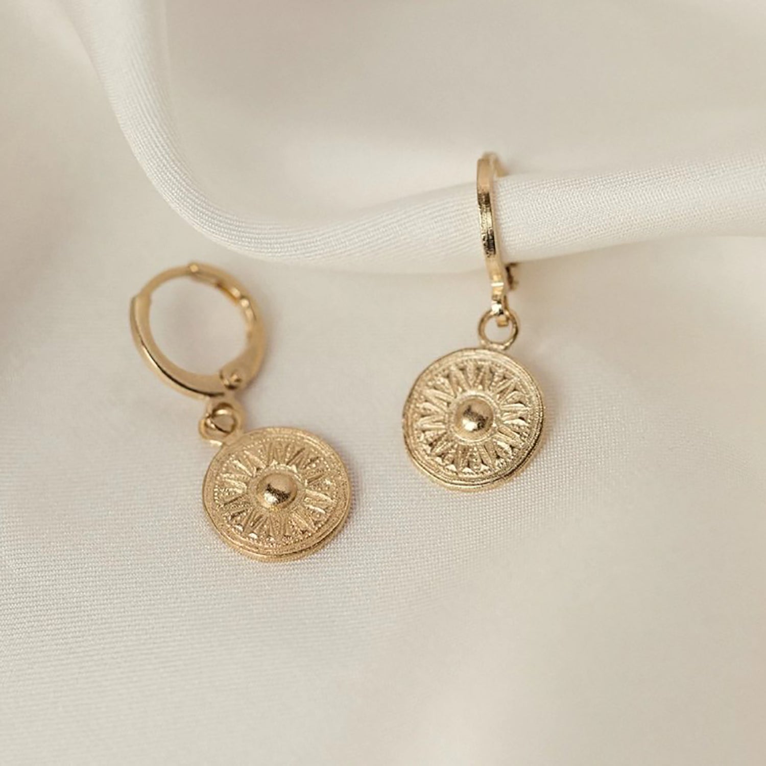 The Isis Earrings from Agapé Studio feature delicate coins which are attached to a huggie style hoop. Elegant and lightweight to wear, these lovely earrings give you effortless style.