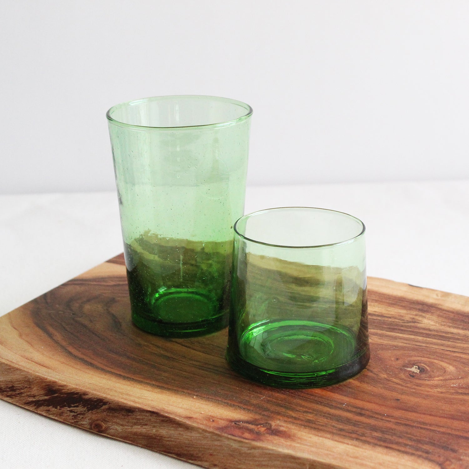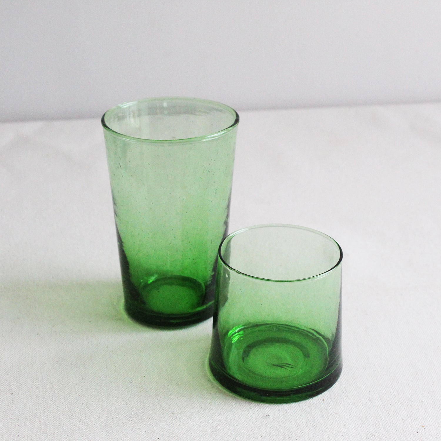 These stunning bottle green tumblers add a striking element to any table. Hand-blown in Marrakesh, these lovely glasses are made from recycled materials which make each piece unique and beautiful to hold.