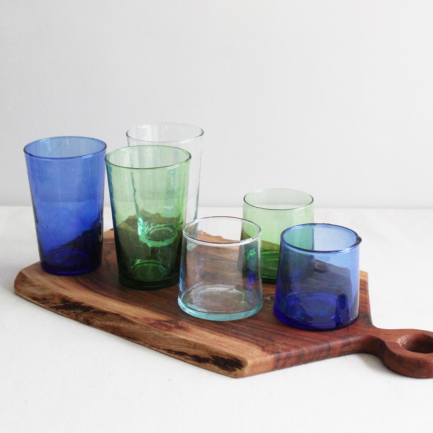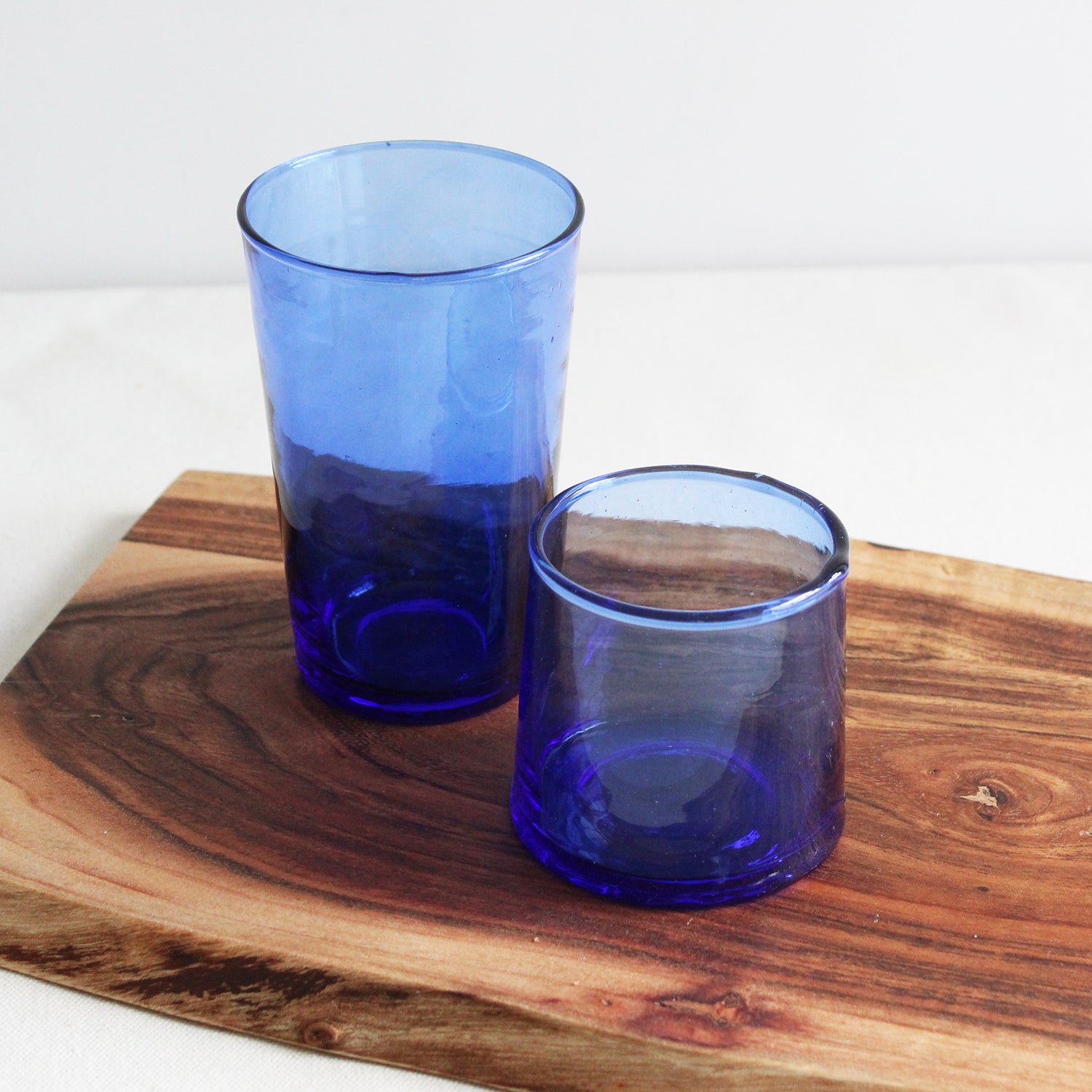 These stunning cobalt blue tumblers add a striking element to any table. Hand-blown in Marrakesh, these lovely glasses are made from recycled materials which make each piece unique and beautiful to hold.