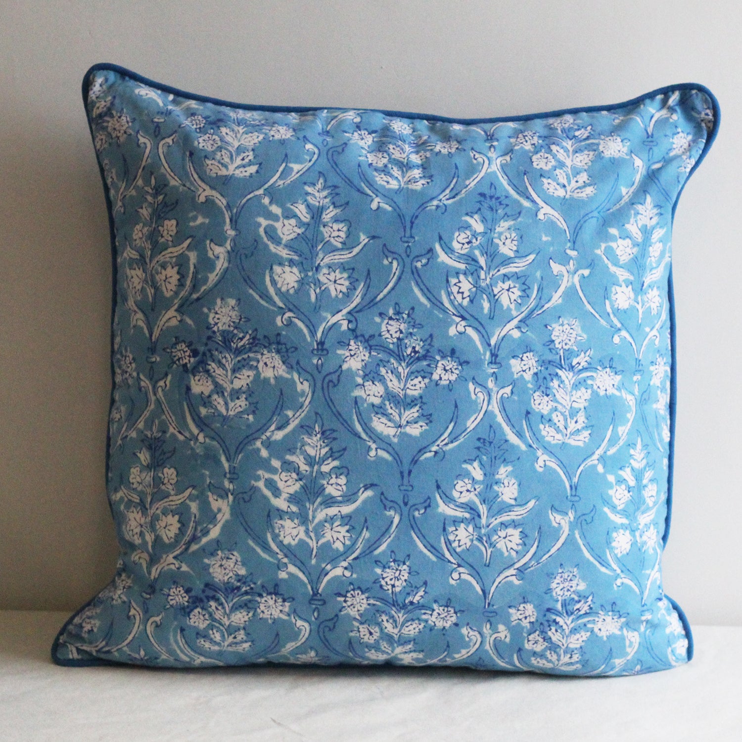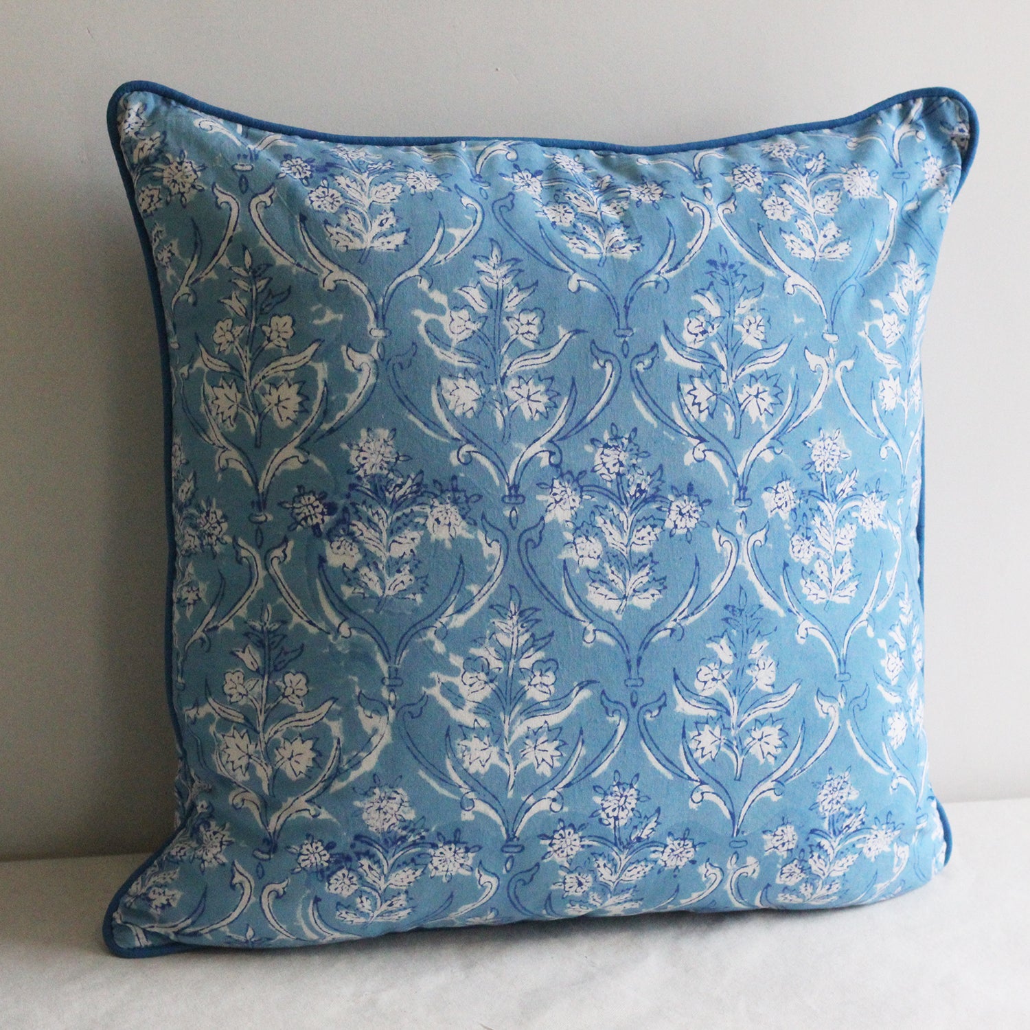 'Vine Leaf' Blue Block Print Cotton Cushion Cover with Piping, 50 x 50 cm