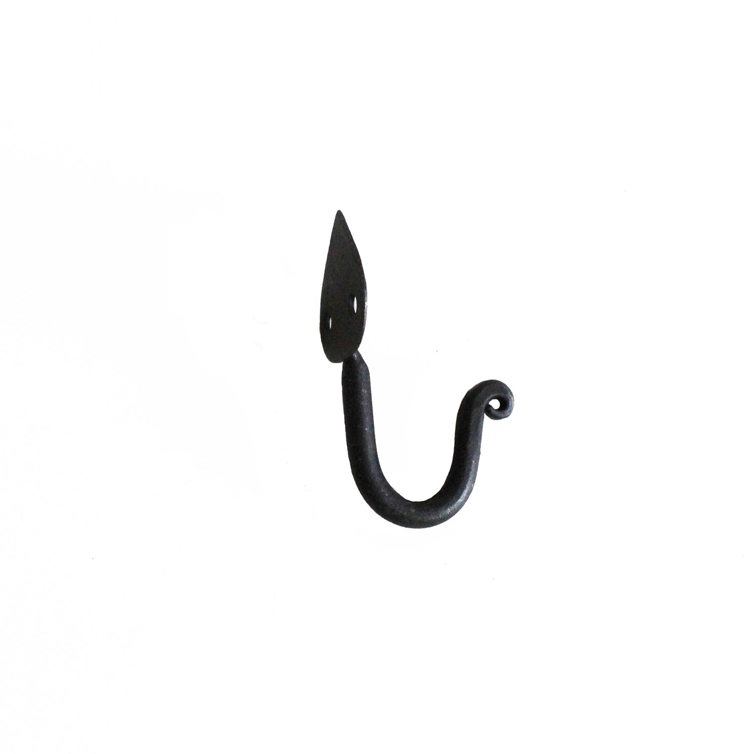 This hand forged iron hook has a spade shaped top and a hook with a rolled end. This dainty hook is ideal for hanging accessories or keys.