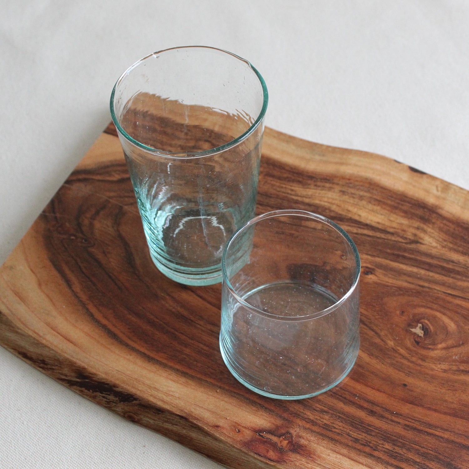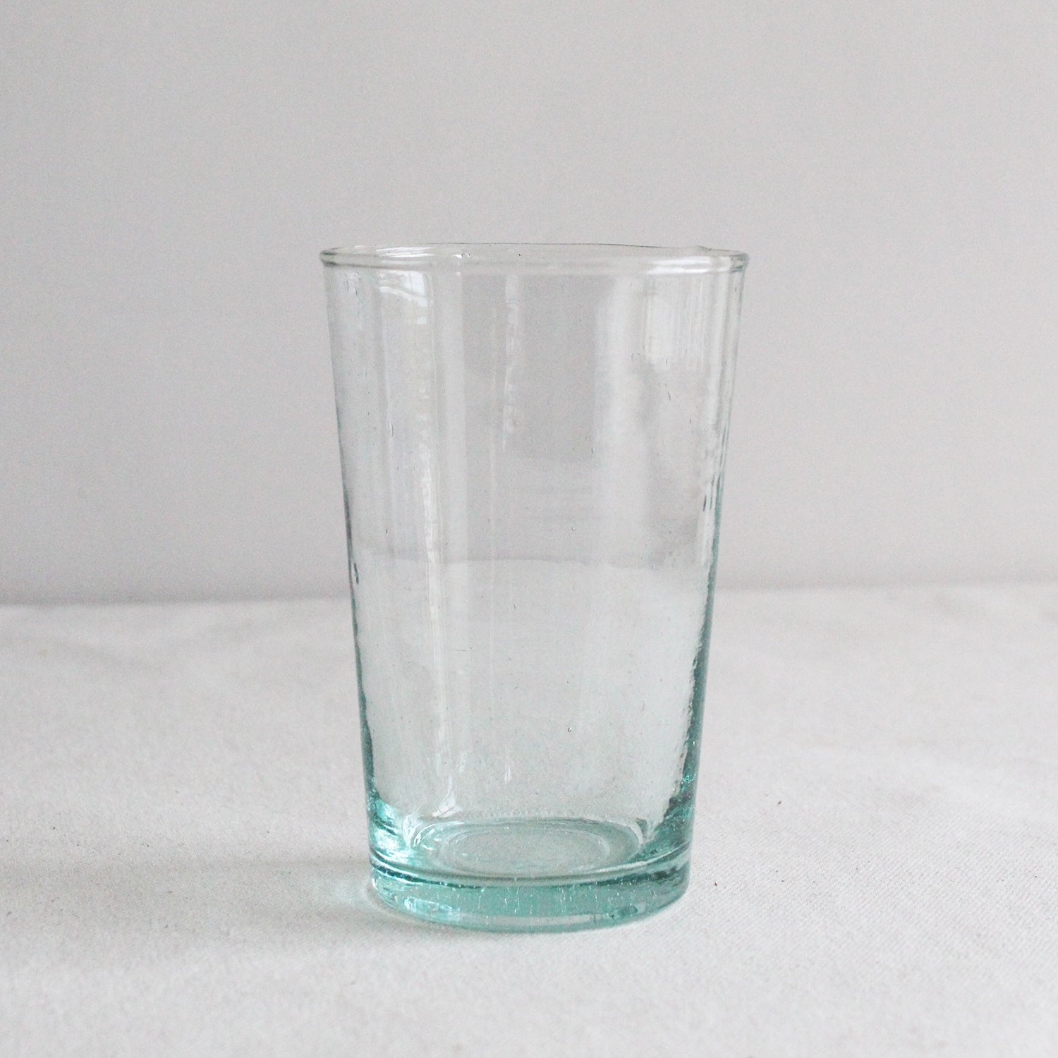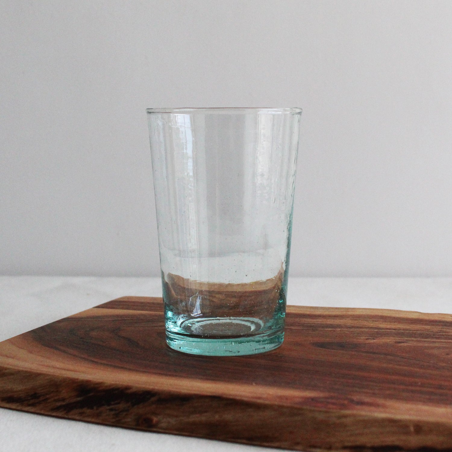 These stunning aqua tinted clear glass tumblers add a striking element to any table. Hand-blown in Marrakesh, these lovely glasses are made from recycled materials which make each piece unique and beautiful to hold.