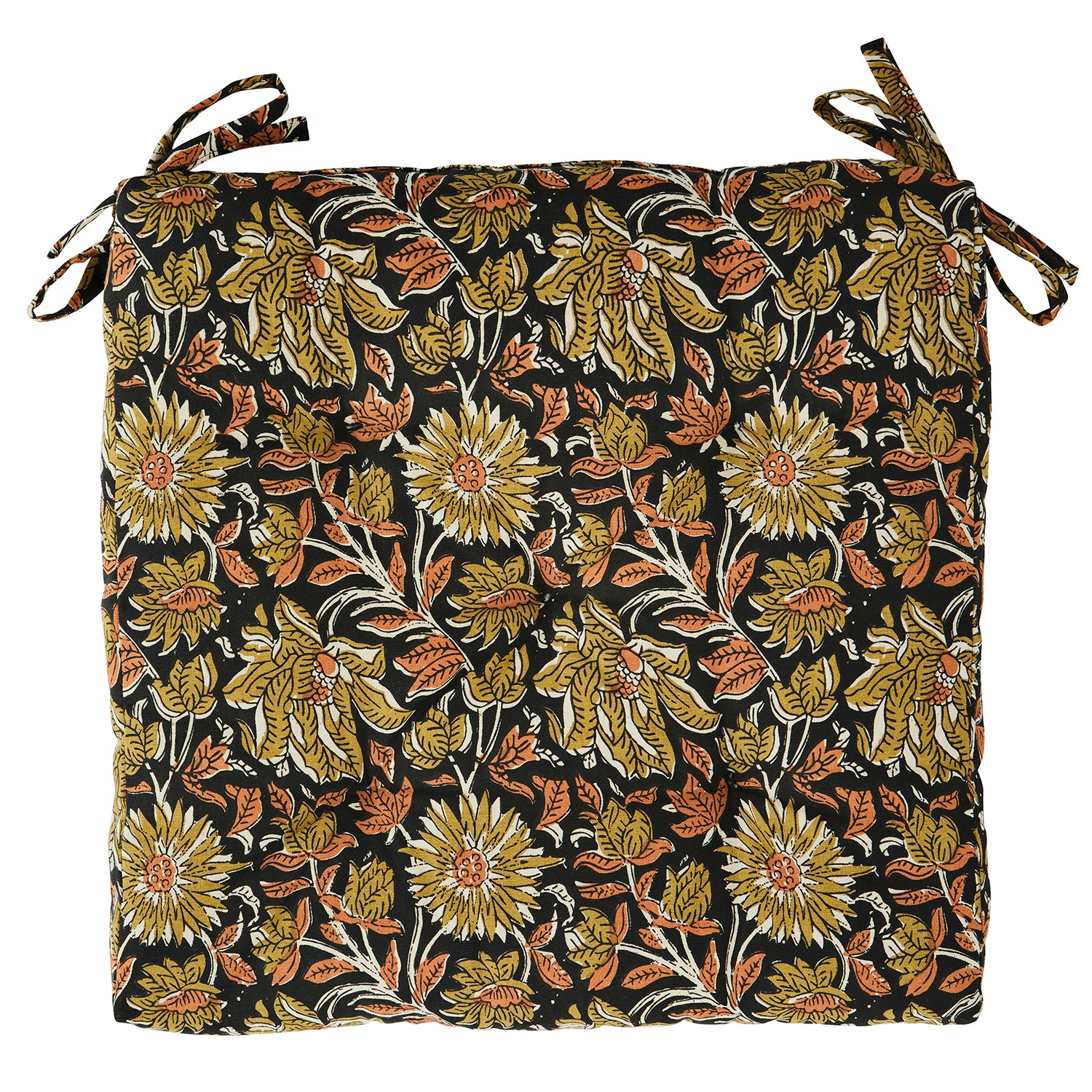 Black, Orange and Mustard Floral Block Print Cotton Chair Pad