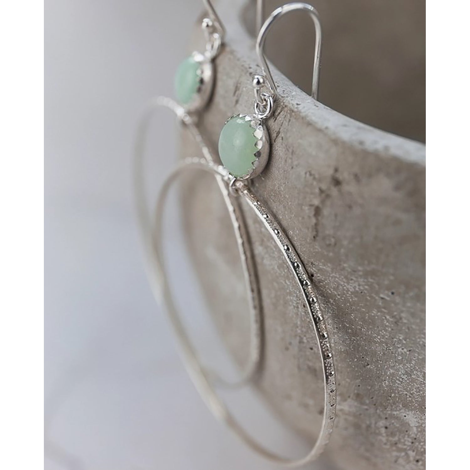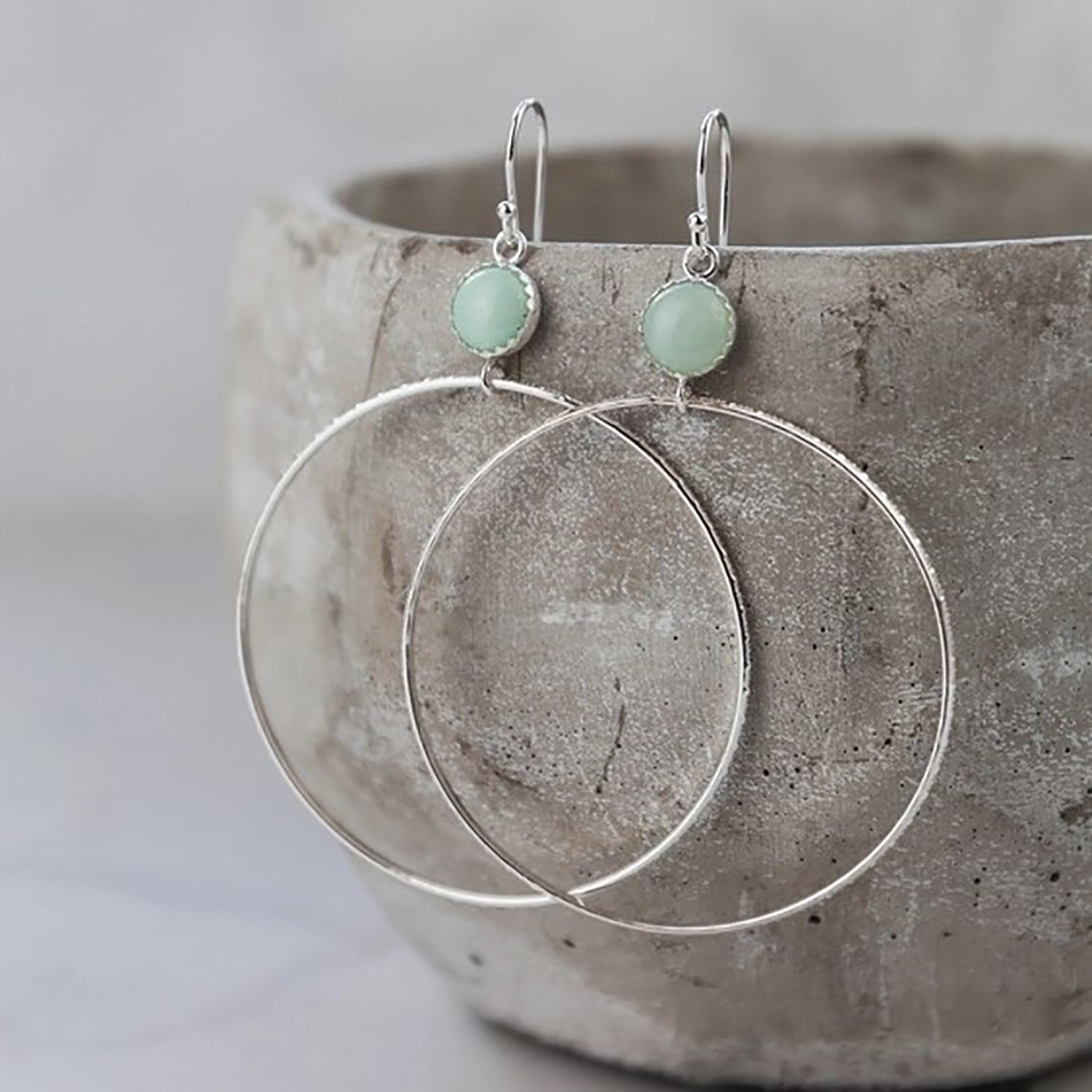 These lovely hoop earrings are lightweight and easy to wear, the luminous green amazonite is a dreamy pairing with the silver metal.