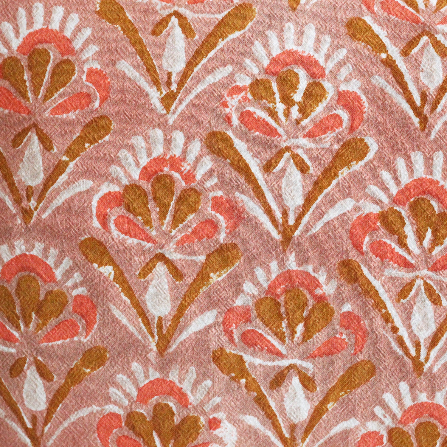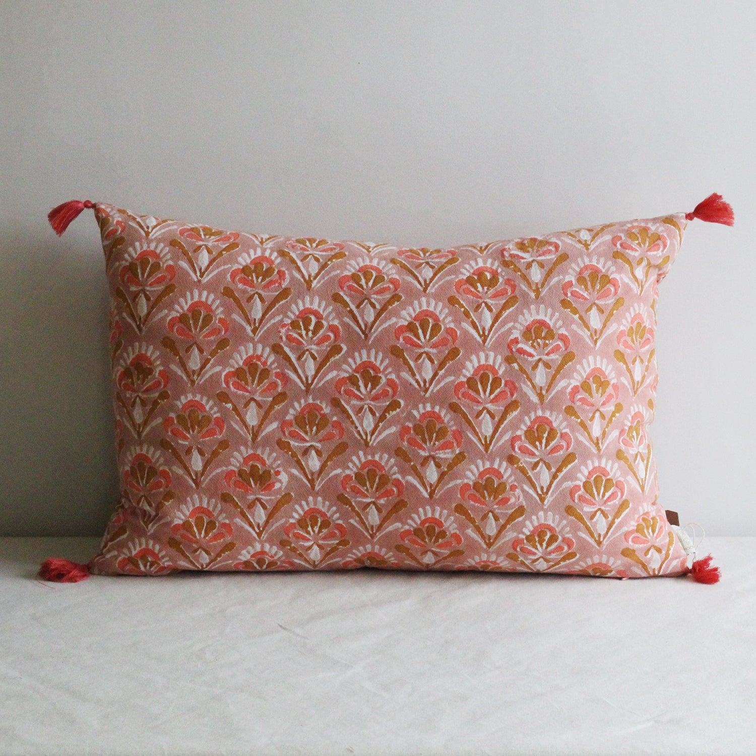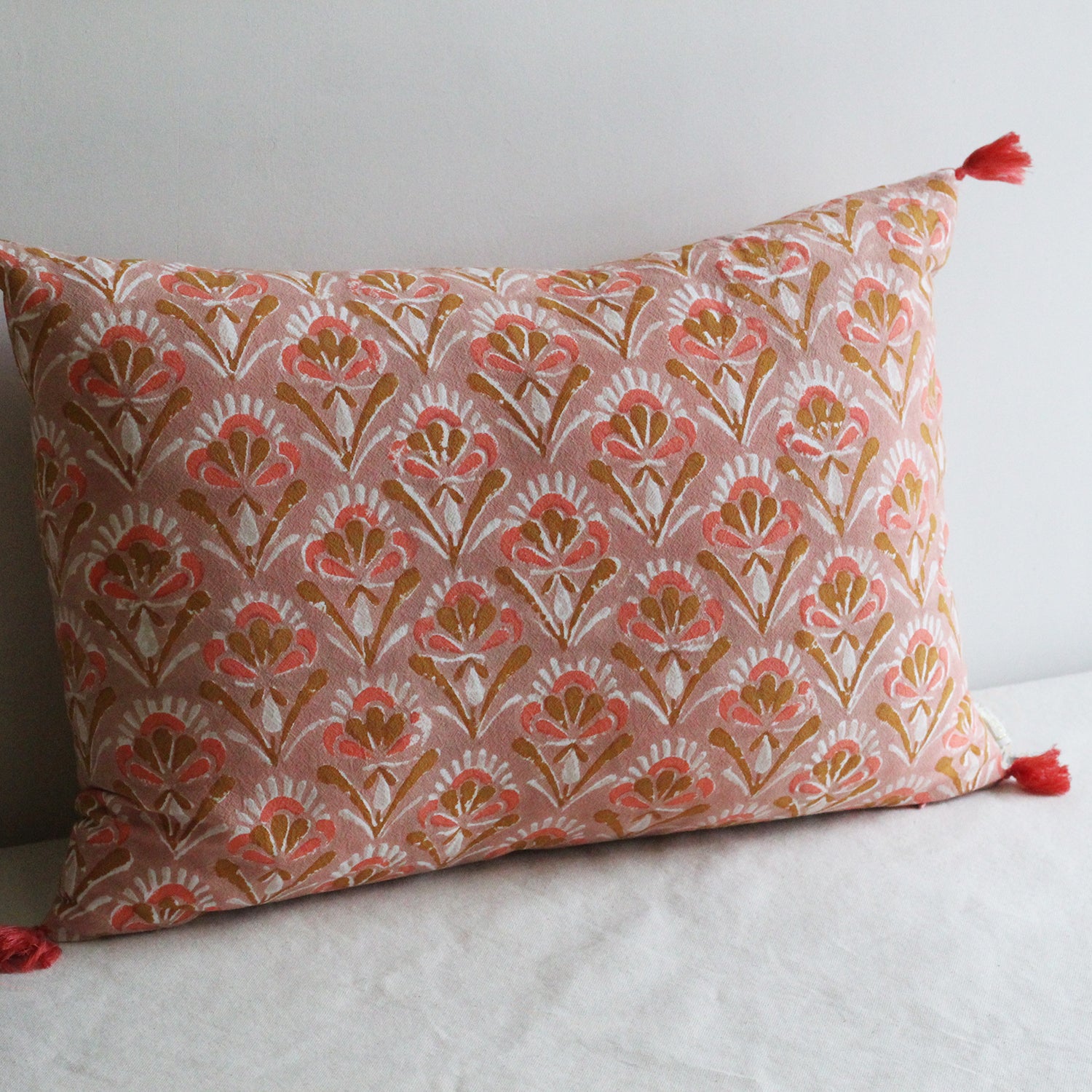 A beautiful and bright cushion cover, block printed with Indian flowers in a 70s style print.