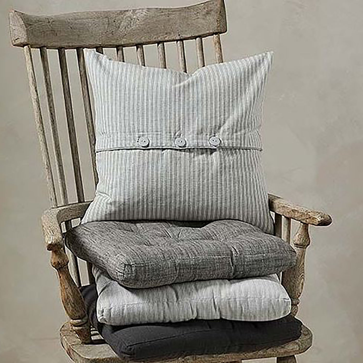 Square 100% cotton cushion cover in grey and porcelain ticking stripe. Buttoned envelope closure trimmed with smart grey piping for easy removal of pad.