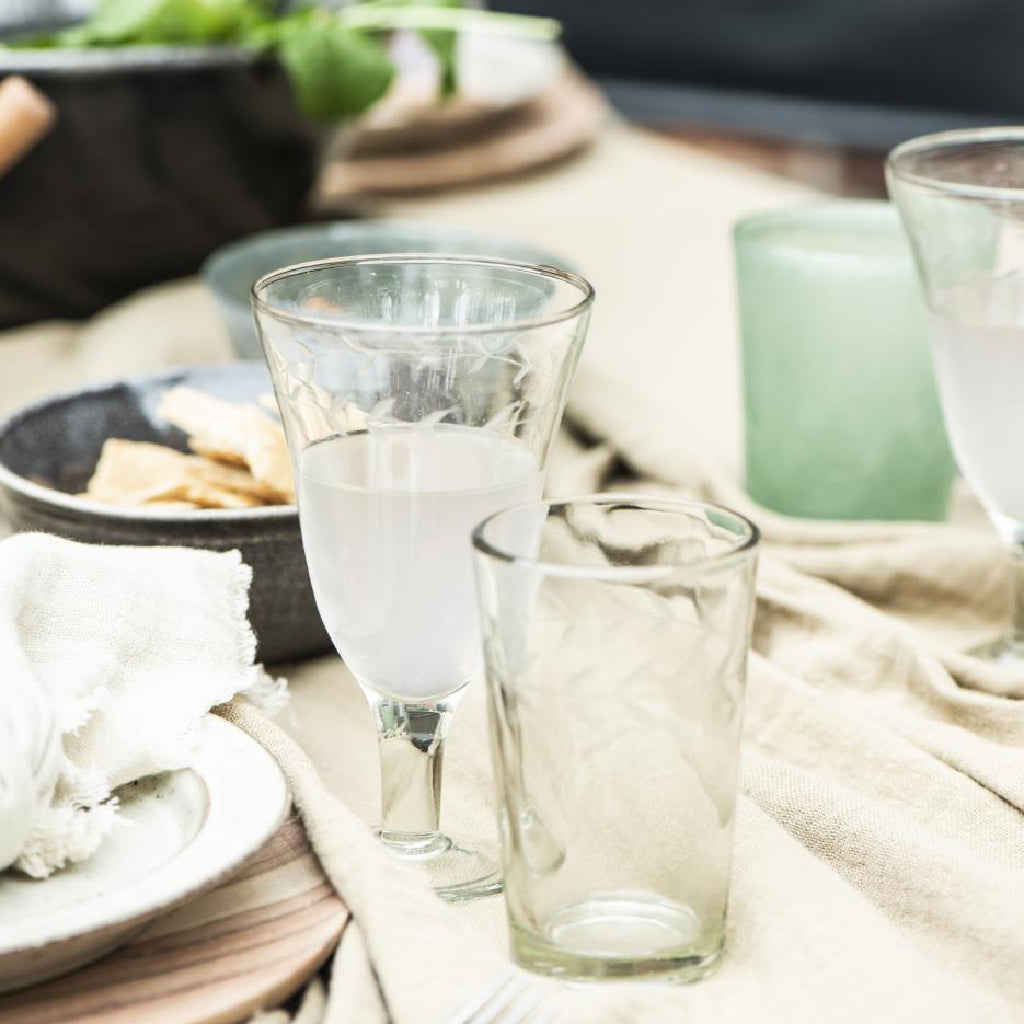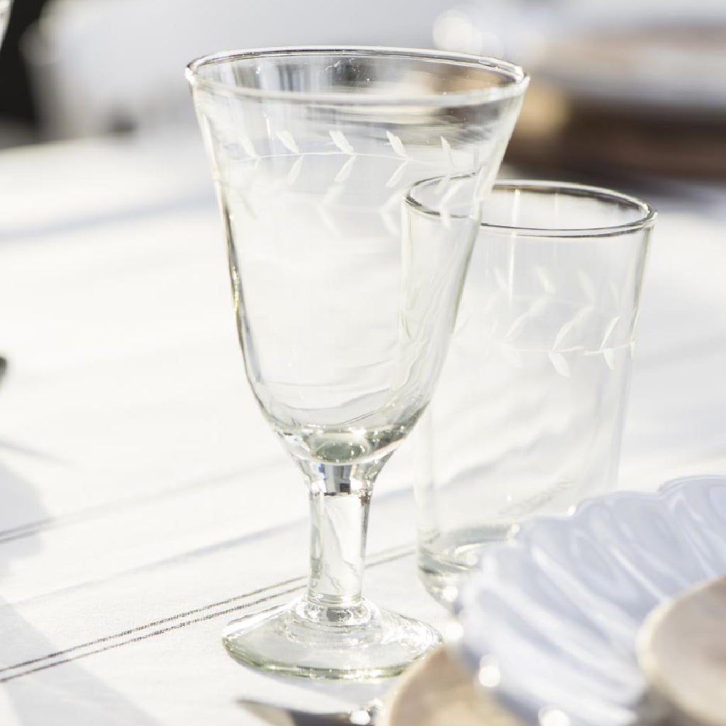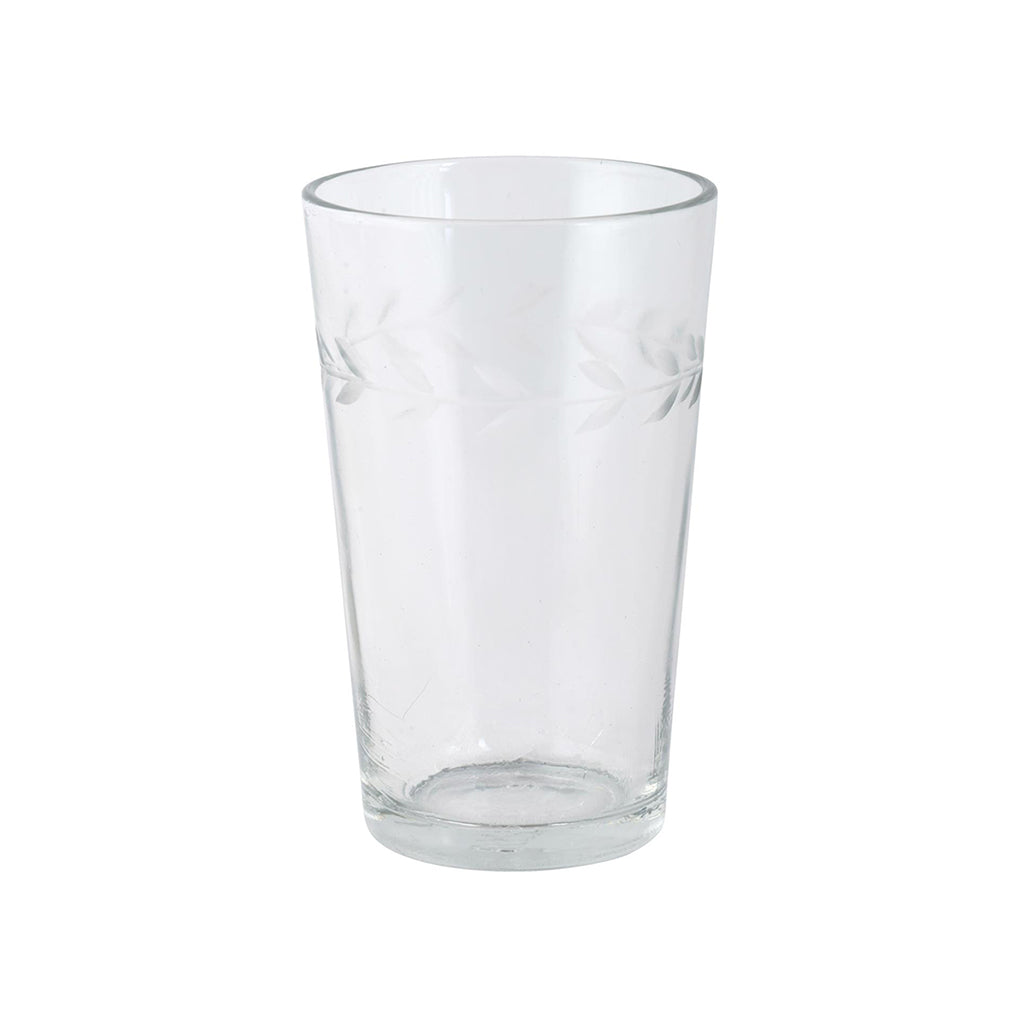 A drinking glass with an engraved leaf pattern running around the sides of each glass. These tumblers look elegant together in a set on the dining table alongside wine glasses with the same pattern.