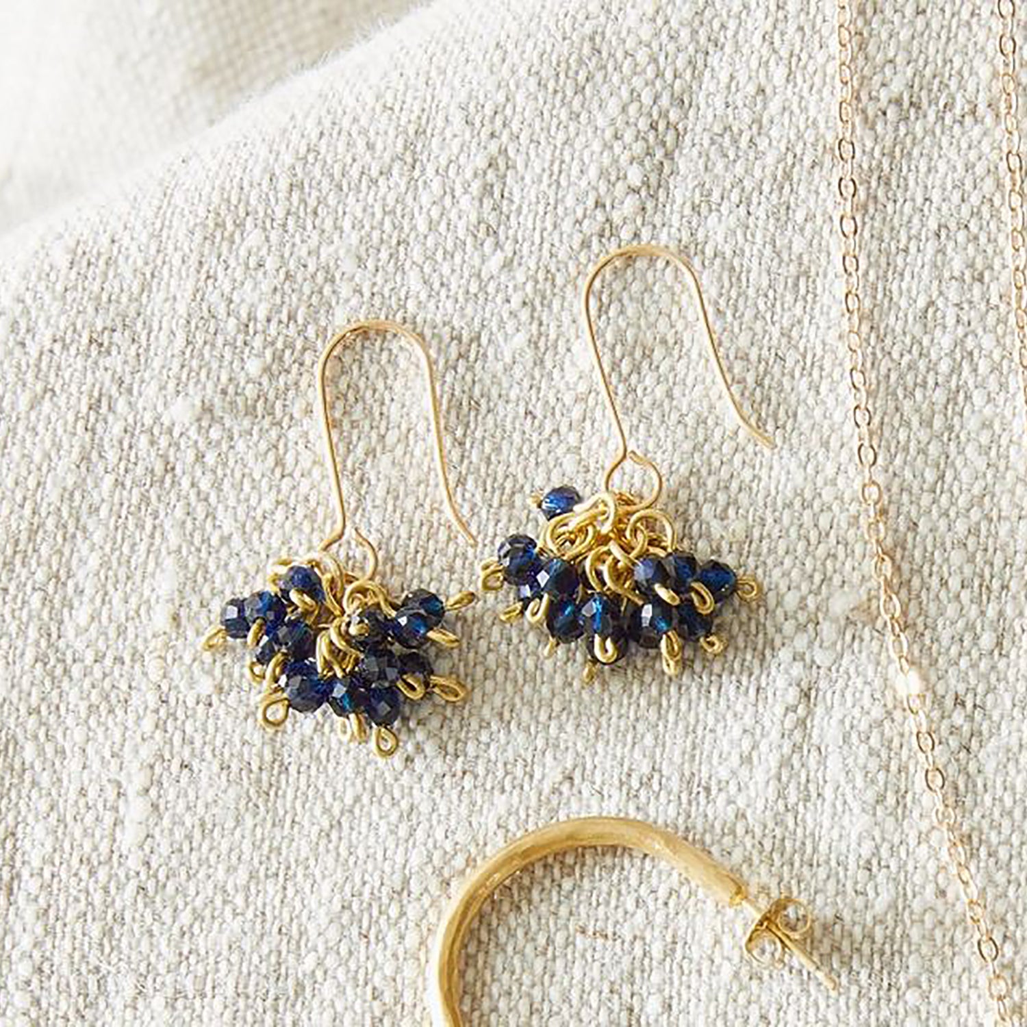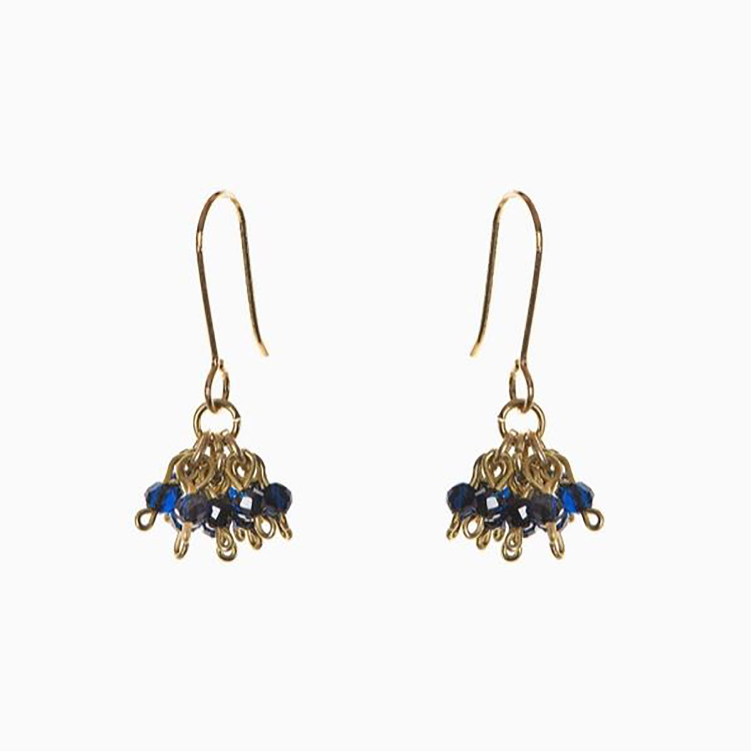 Individual glass crystal beads are skilfully combined together to create shimmering clusters, perfect for dressing up any outfit. Handmade by the women from the Flowering Desert in India, from glass crystal beads with brass wire and gold plated brass earring hooks.