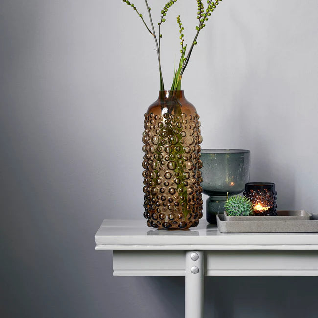 Inject some stylish informality into your interior style with the Foam glass vase. House Doctor has designed it in a warm amber colour and with a bubble surface that adds subtle detailing and a slightly quirky touch to your home décor.