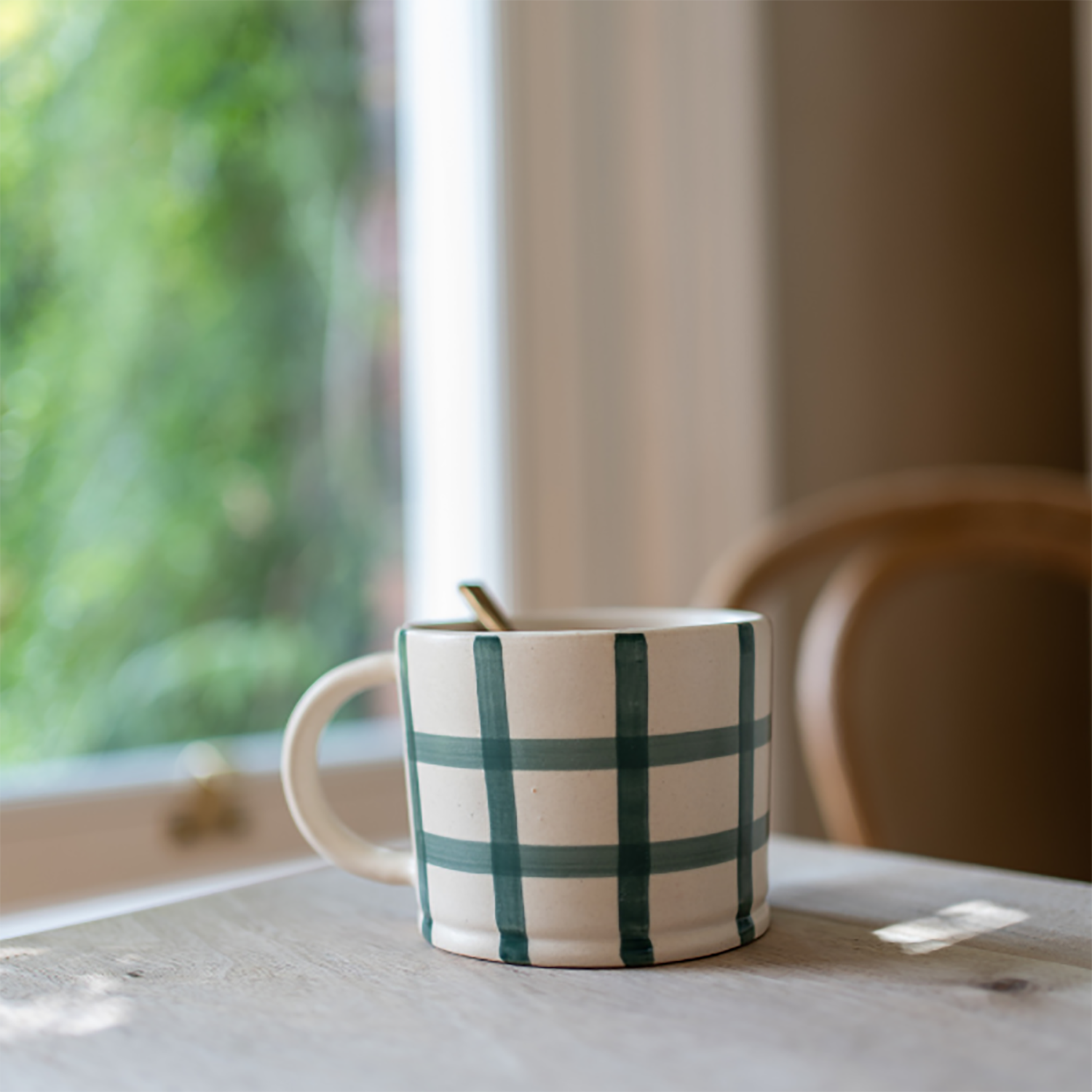 Hand finished matte glazed mug with a painted forest green gingham design. Mix and match with other designs from the collection for a fun tea break! Our glazes are hand dipped and painted so the finish will vary from piece to piece.