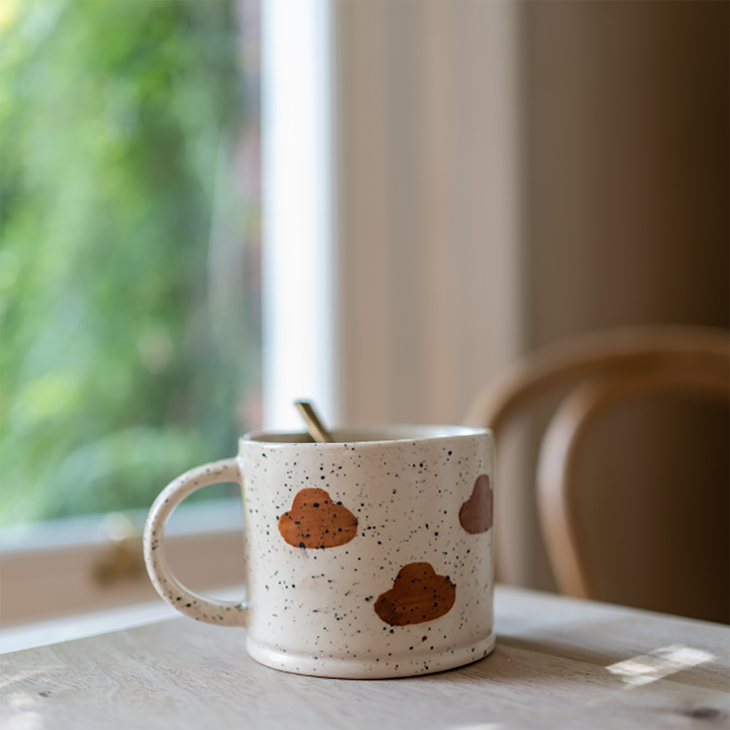 Hand finished matte glazed mug with a painted burnt orange cloud design. Mix and match with other designs from the collection for a fun tea break! Our glazes are hand dipped and painted so the finish will vary from piece to piece.