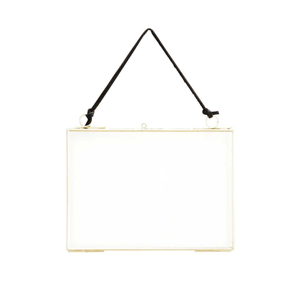 This clear glass gold frame is perfect to display keepsakes or mementos, pressed flowers or your favourite photographs. Hung with a leather string.