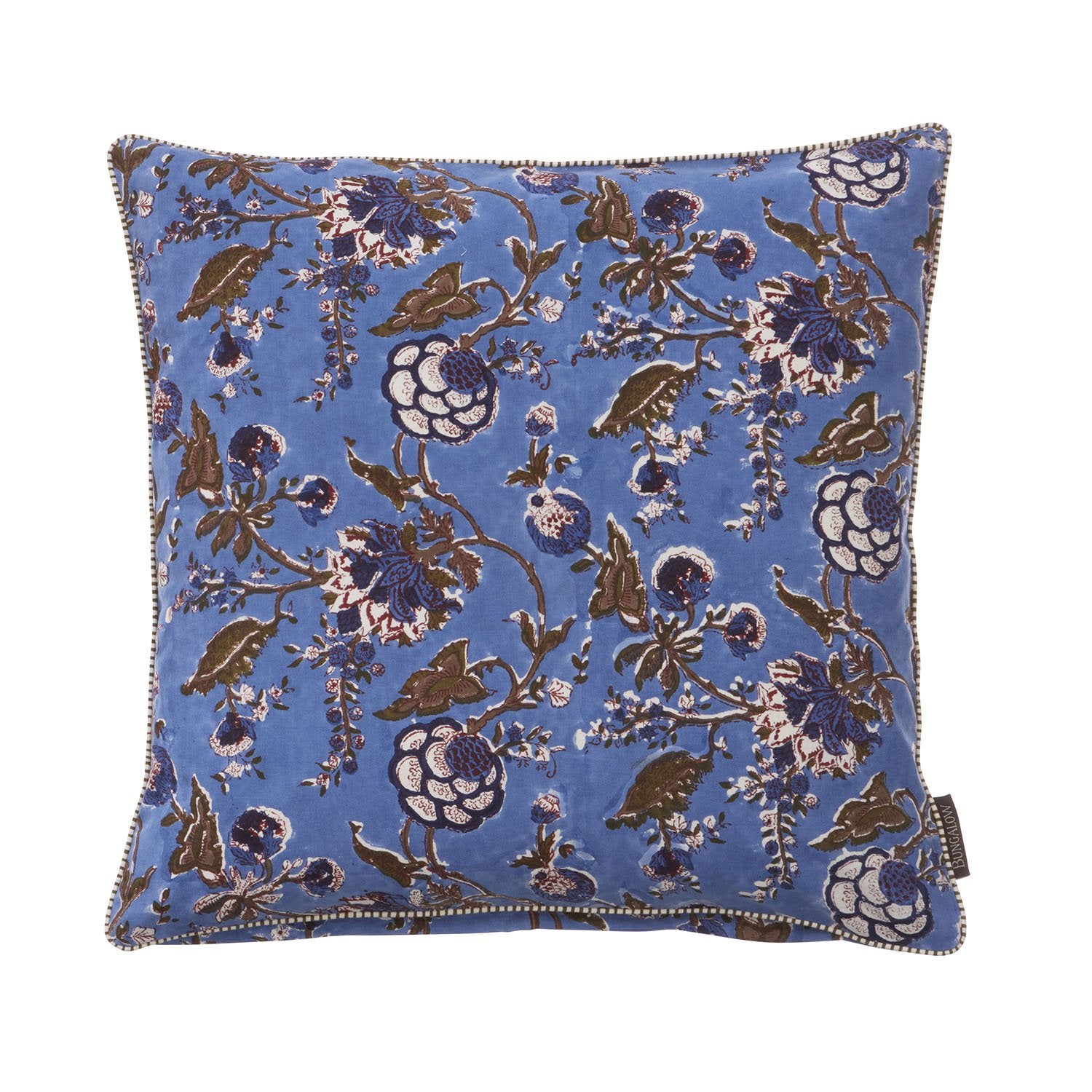 This cushion has a stunning, painterly quality with delicately printed floral details. In shades of olive, blue & red, the main colour of the cushion is Riviera blue.