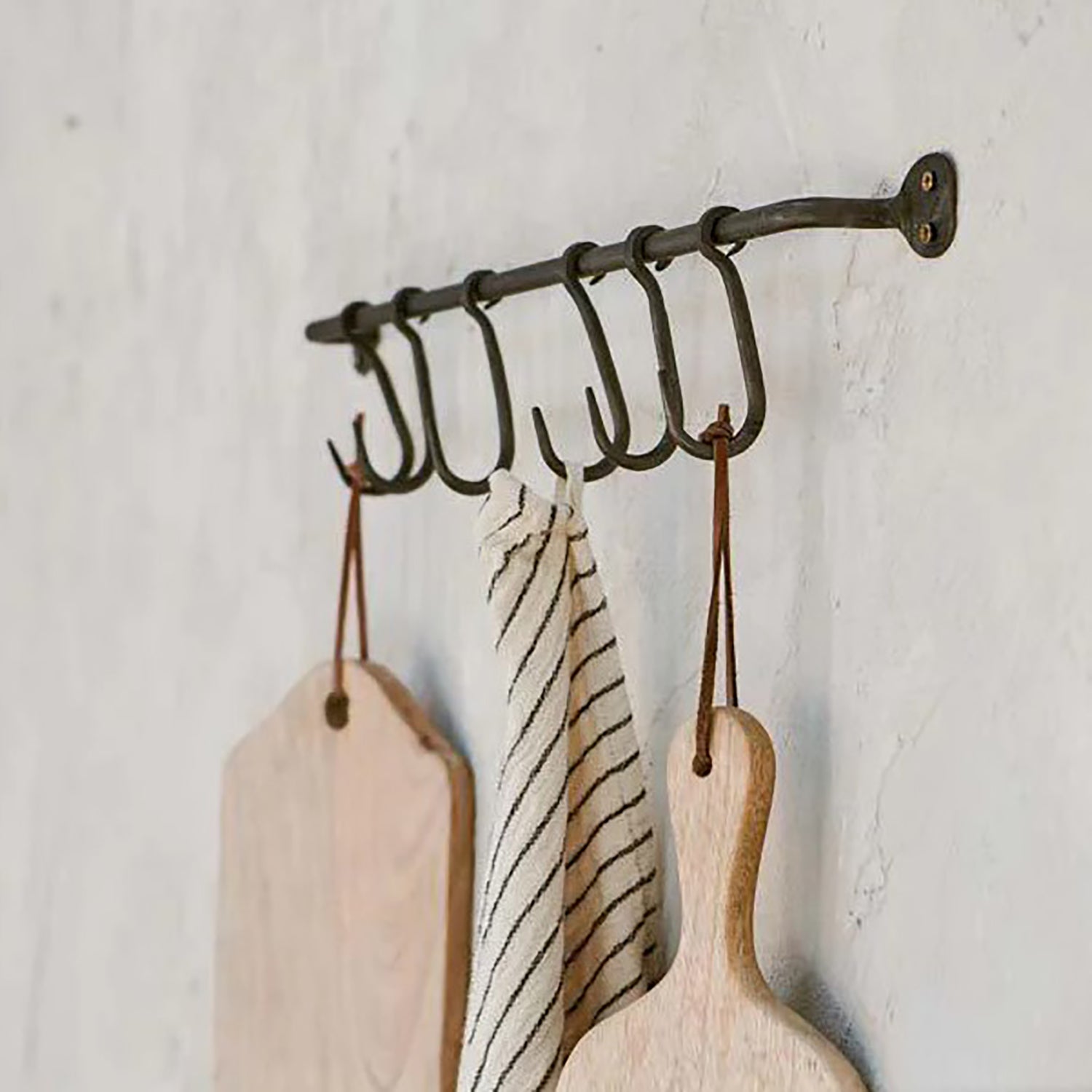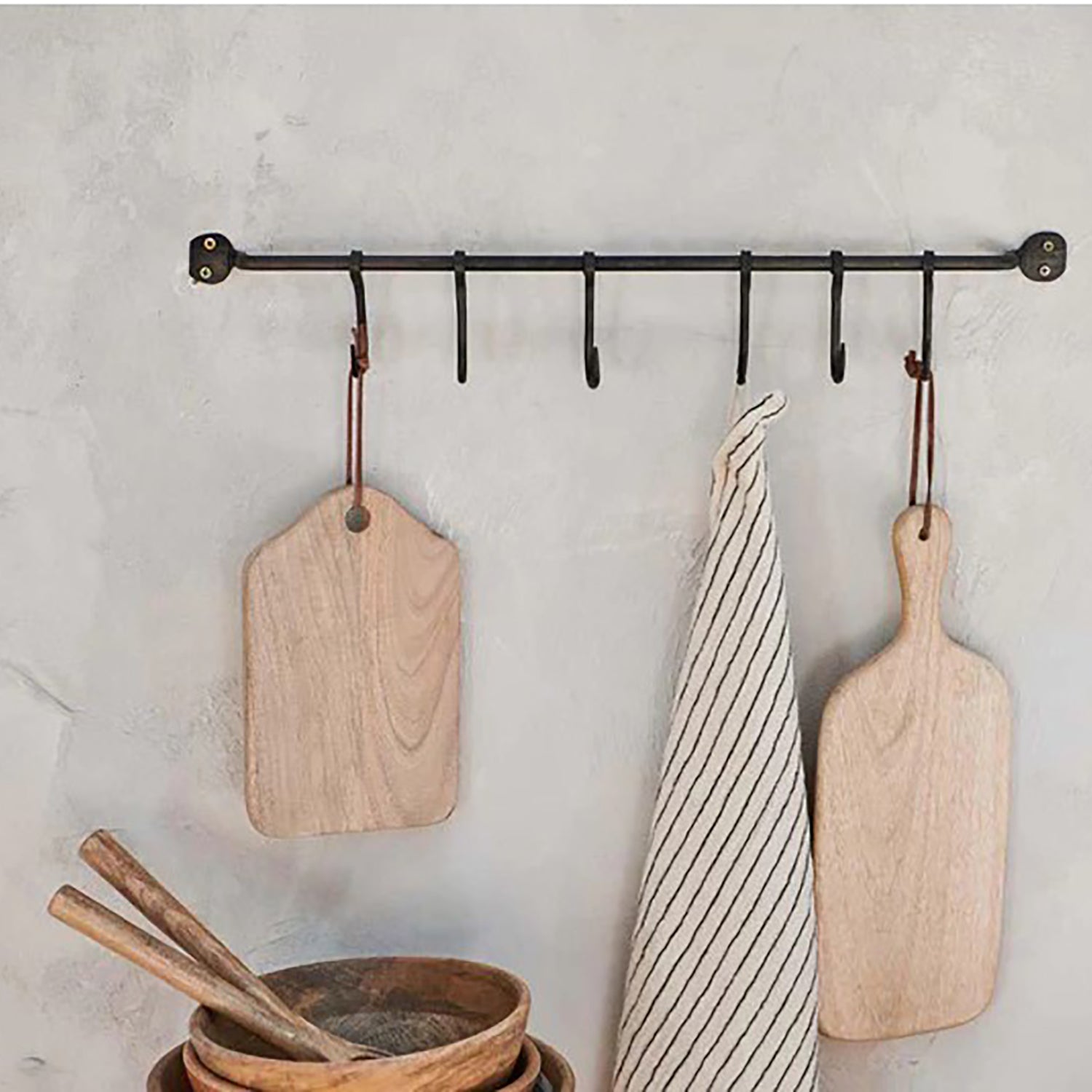 Simple, elegant and practical, the Ikomo hooks from Nkuku have a stylish solid iron bar and hooks, finished with an attractive antique effect. Perfect for all kinds of hanging storage, from kitchen to bathroom.