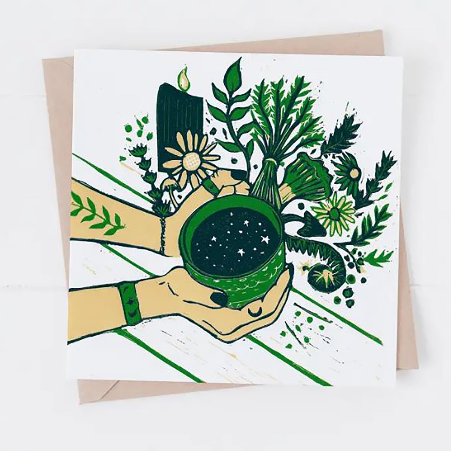 Blank inside with a brown Kraft envelope, made from recycled card stock. Digitally printed, taken from original linocut designs.