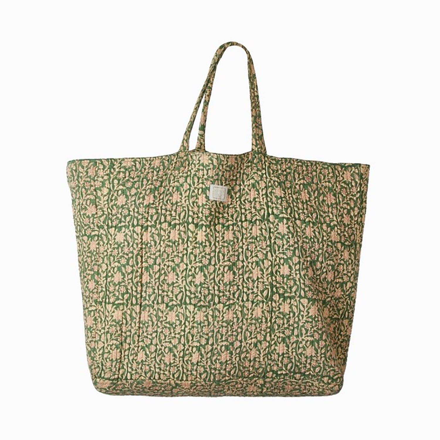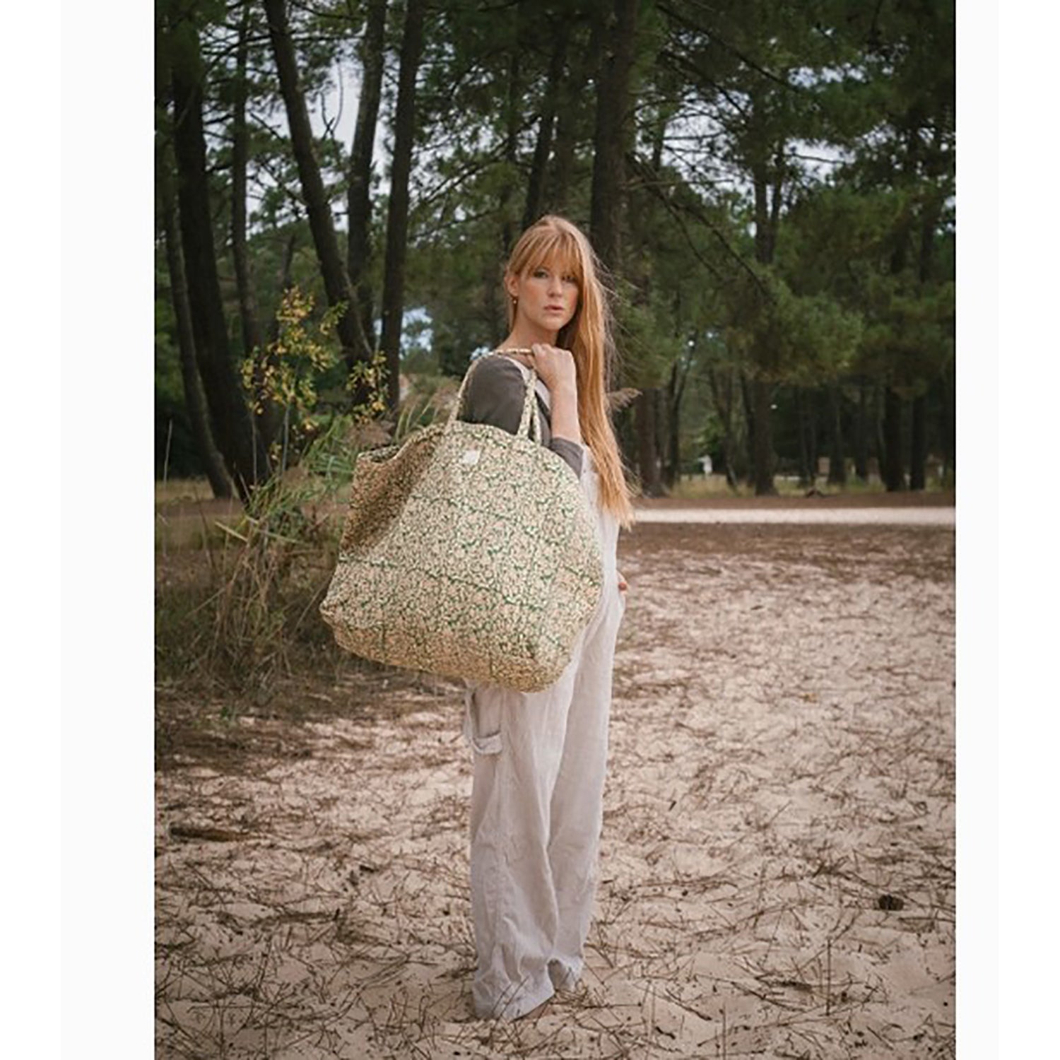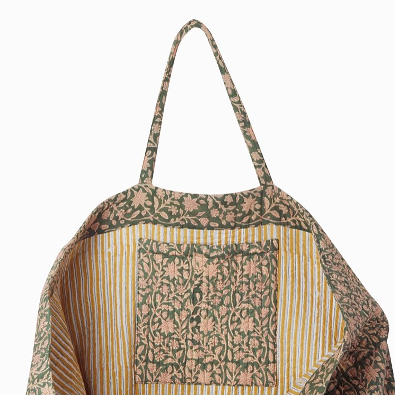 Large “shopper” bag printed with Indian flowers. Printed by hand using the technique of wooden stamp in vegetable dye and natural pigments. Featuring long handles for a super comfortable shoulder carry and wide side gussets to be able to slip in a multitude of treasures. We love its striped lining and its inside pocket which nicely finishes this multi-function bag as well as its vertical quilting.