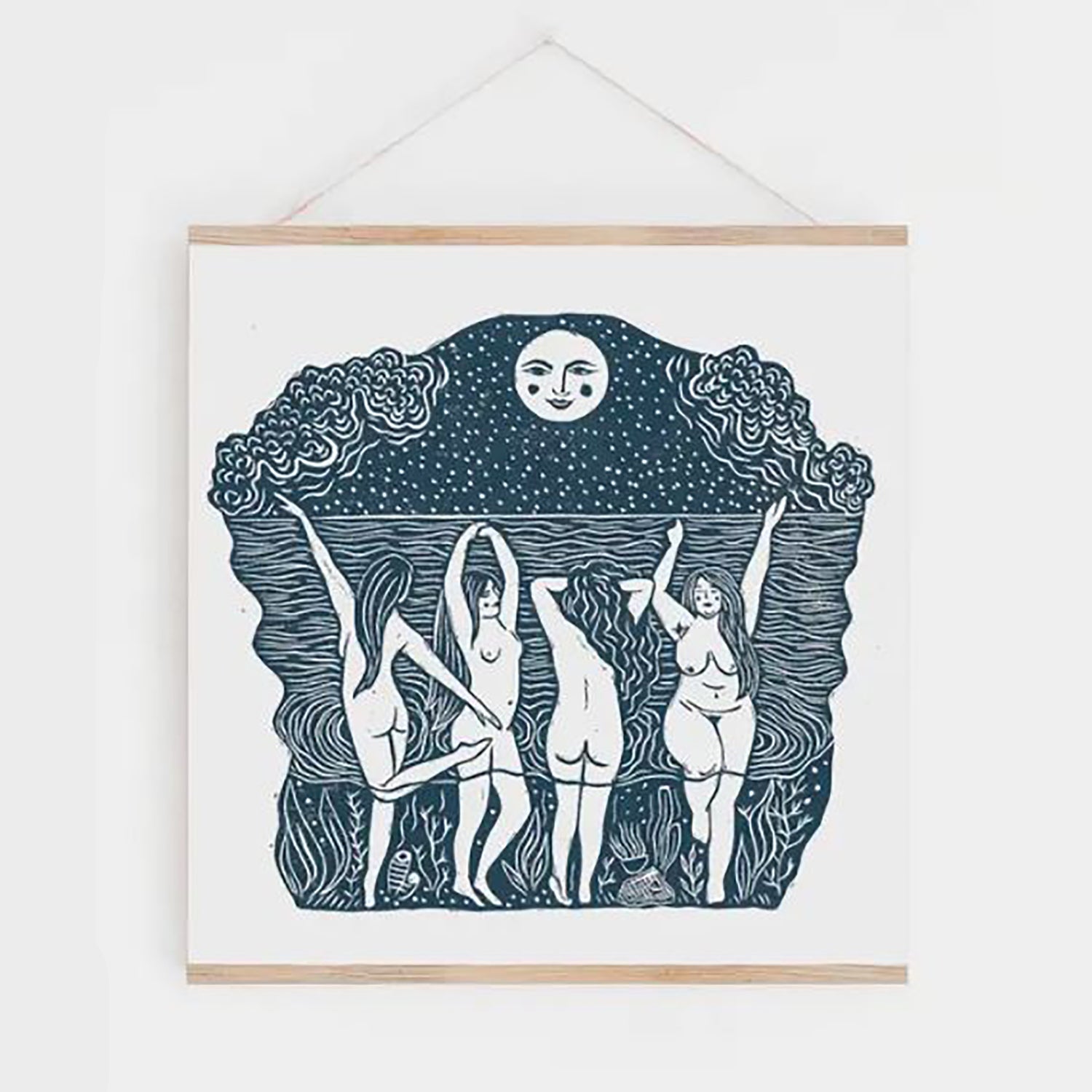 4 women dance to the light of the moon in a calm sea. This is a playful print, exploring the feminine connection to the moon and tides- nature, paganism and inspired by medieval and historical engravings of old. A limited edition run of 150.