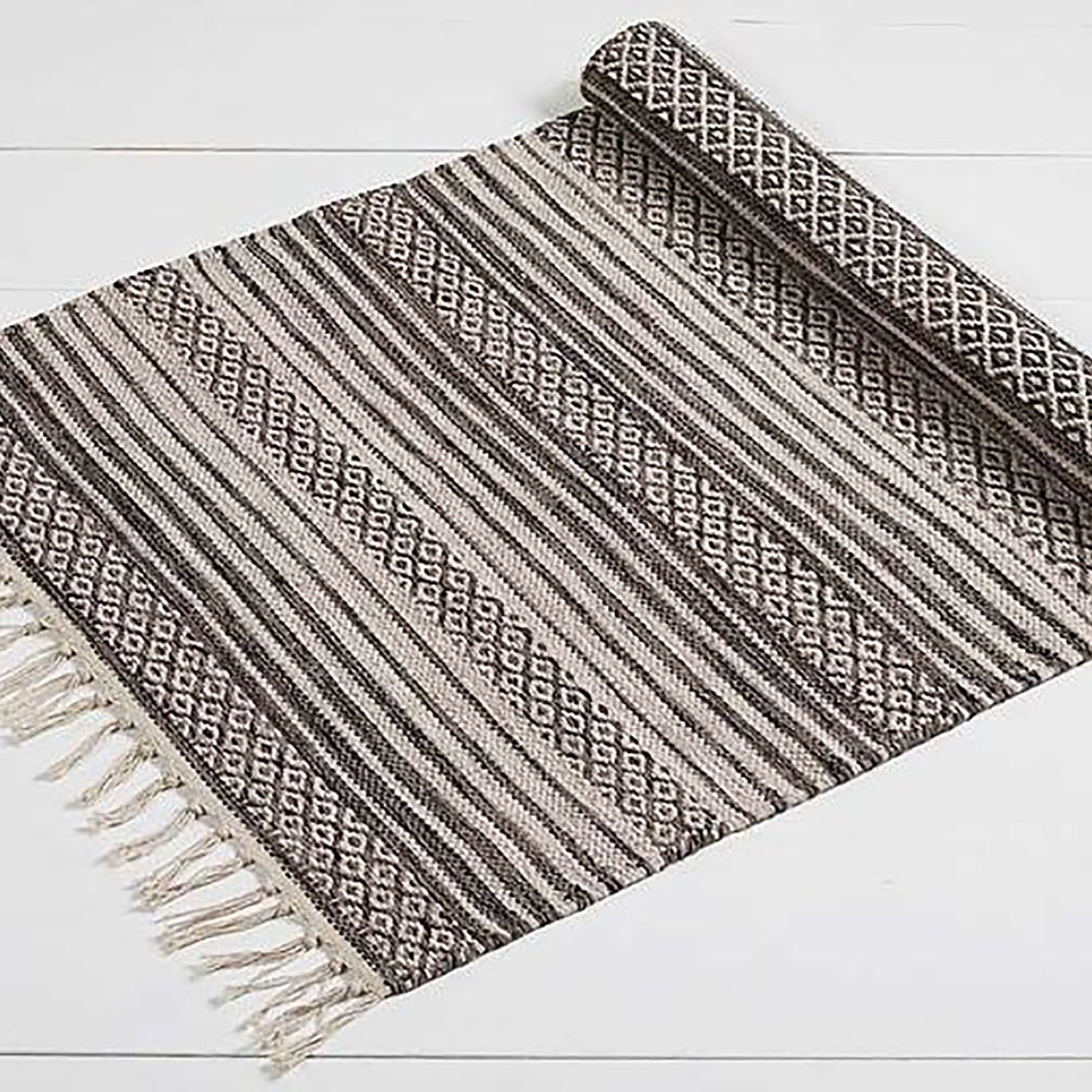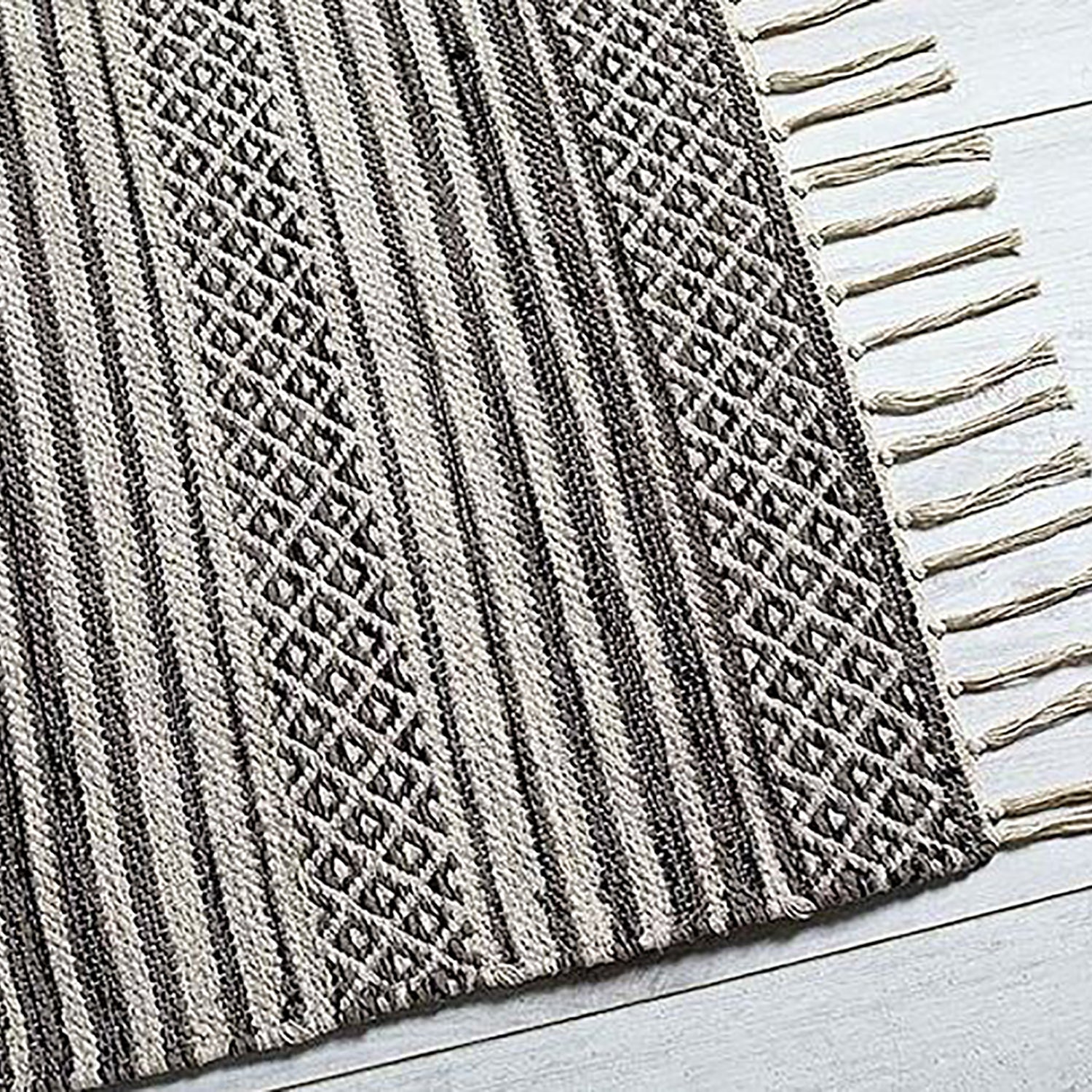 Striped rug woven in 100% cotton in natural and charcoal finished with knotted tassels.