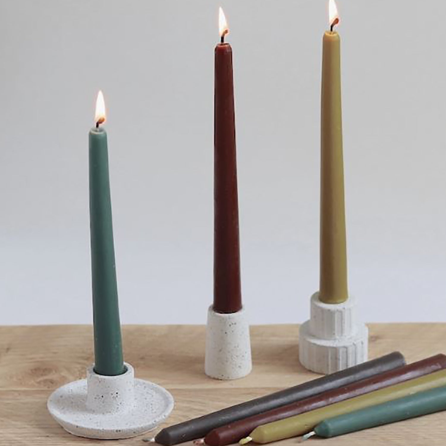 Beeswax 100% natural dinner candles, made with eco dye. Beeswax is a naturally occurring product made by bees, and has a naturally sweet and subtle scent. These candles are dripless and smokeless, have a long burn time, and do not stain.