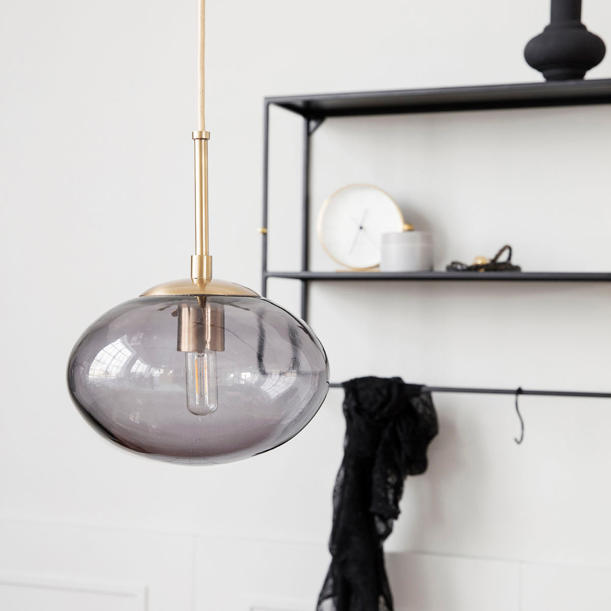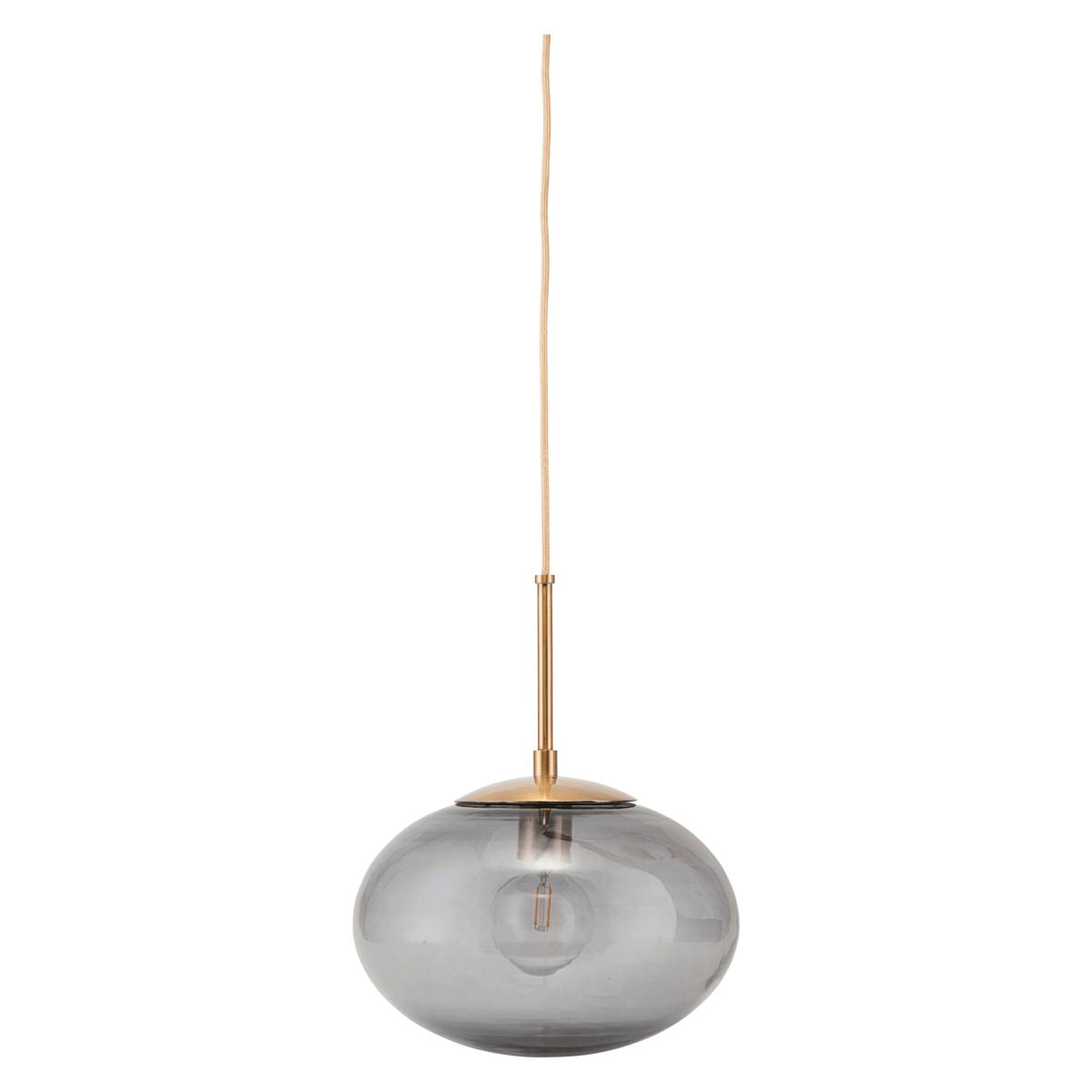 With a handsome light source, you can create a cosy atmosphere in your home while also using it as a decorative item. This stunning pendant lamp from House Doctor is called Opal and is designed with a sophisticated and exclusive idea in mind. The combination of the grey smoky coloured lamp shade and the brass coloured metal bar makes for a beautiful lamp that becomes an instant eye-catching item in the home. The lamp has a diameter of 22 cm, a height of 17 cm, together with a 2,5 m cord. Hang it above your dining table, kitchen island or use it as a cosy light source in the living room. Light bulb is not included. This product is handmade which means that variation in colour, size and shape may appear. For Opal, you will need an E14 bulb with max. 40W.