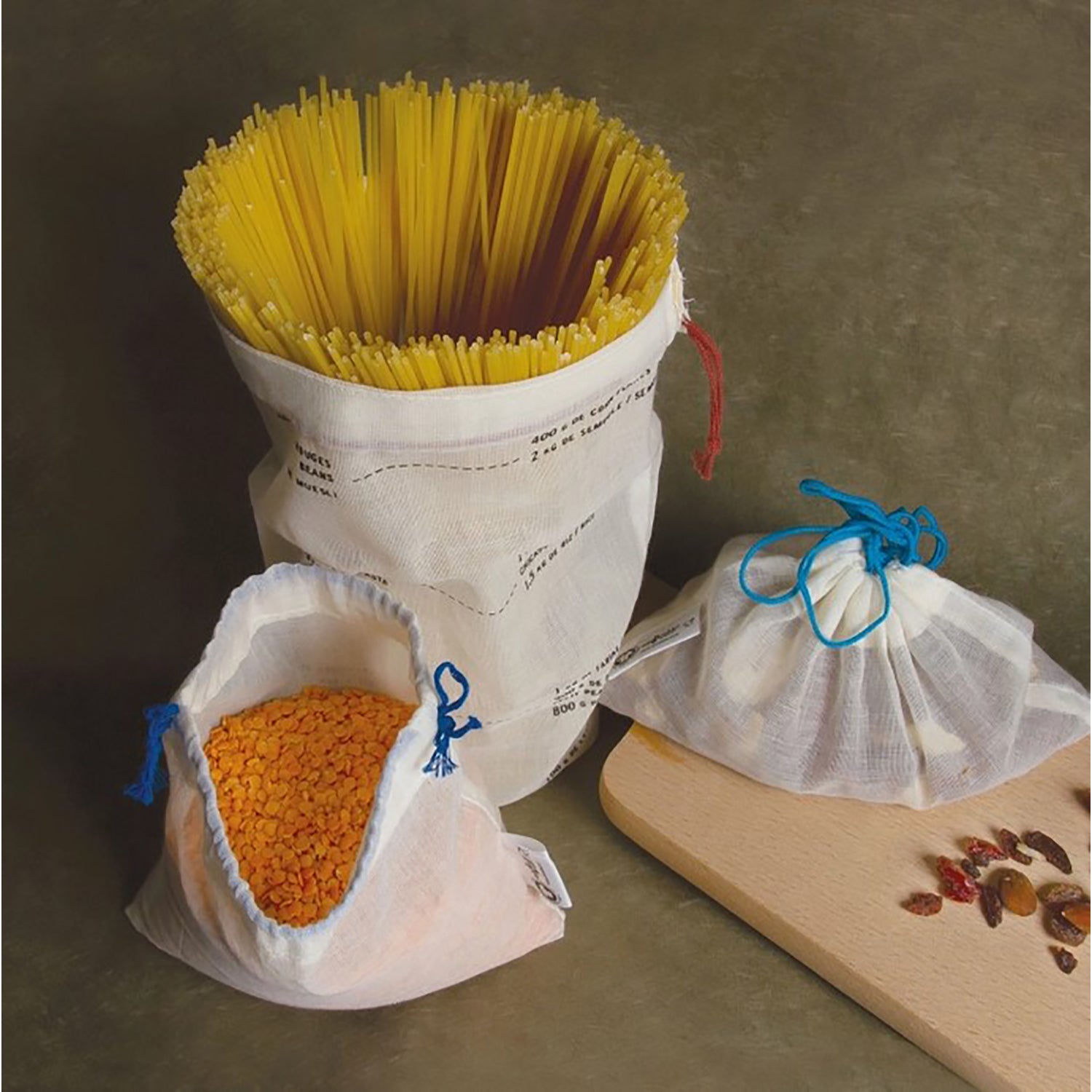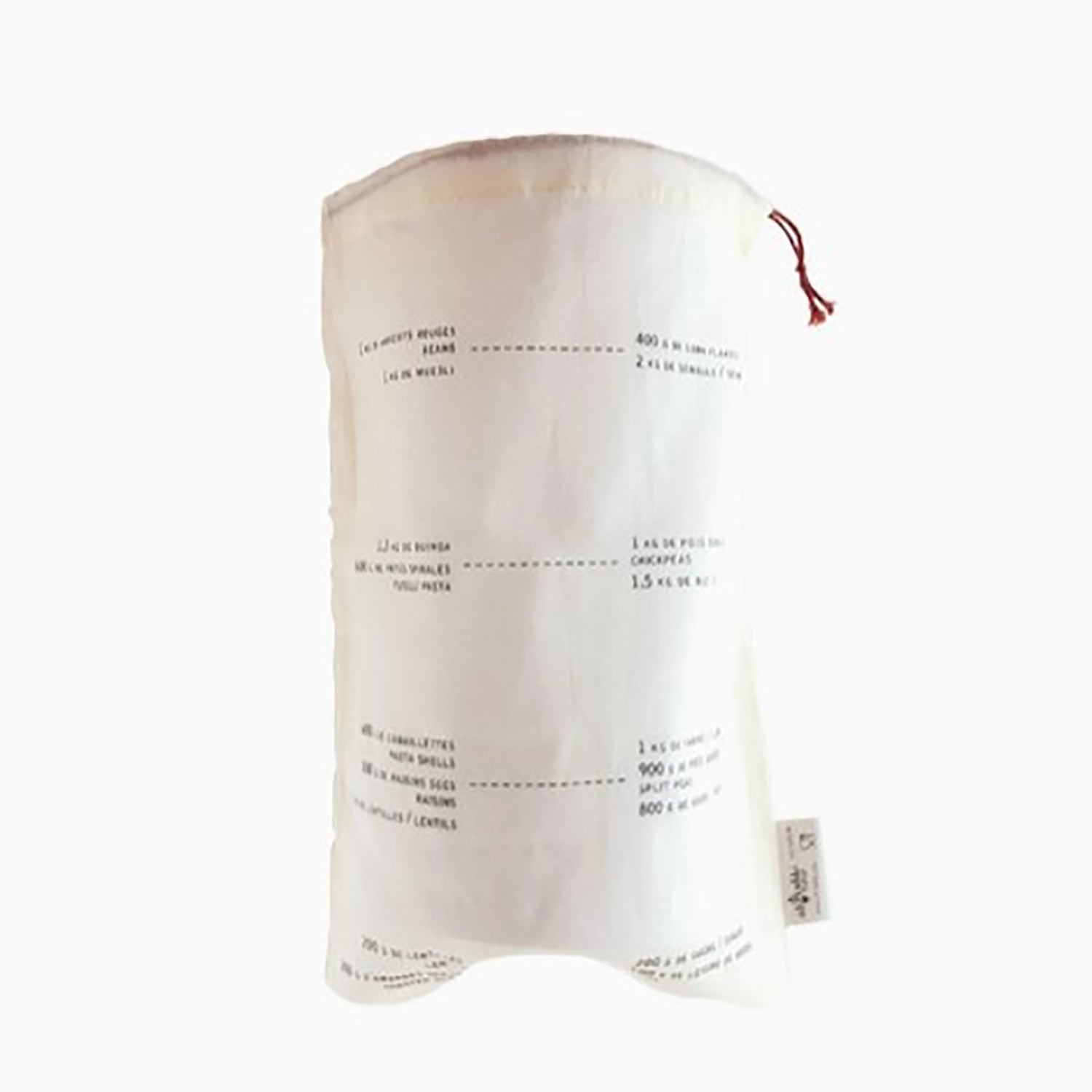 Thinly woven in organic cotton gauze to let food breathe and designed to carry a weight of up to 2.5 kg. Weight indications per food (red beans, quinoa, shells, rice, oatmeal, bulgur, etc.) are printed on the bag.