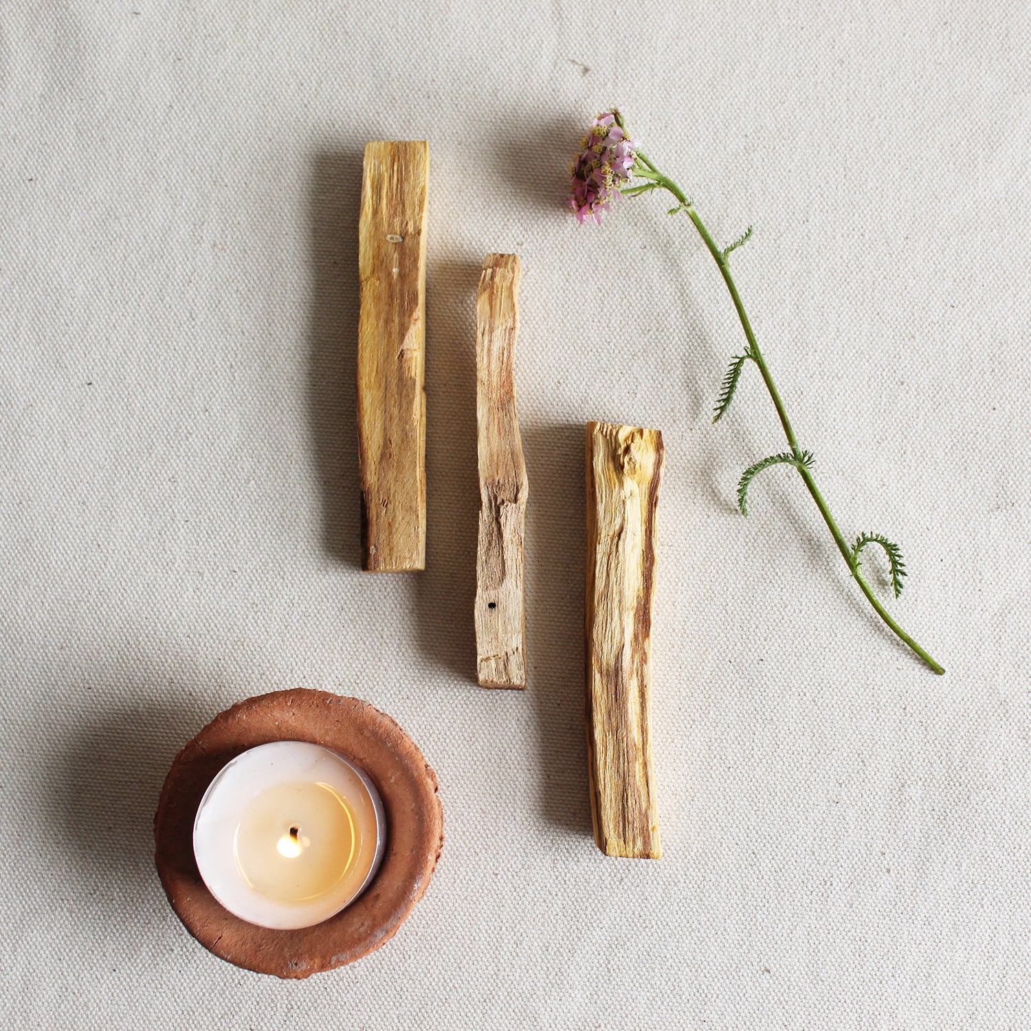 These Palo Santo sticks are grown in Peru, and have a subtle, sweet, and woody scent with hints of citrus. Simply light with a lighter or matchstick and allow the smoke to drift around to cleanse the air.