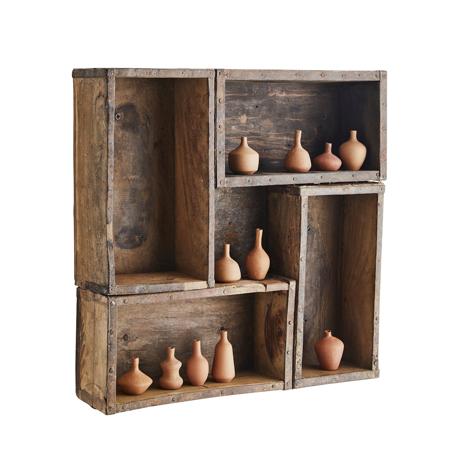 A unique wooden shelf made from old brick moulds.