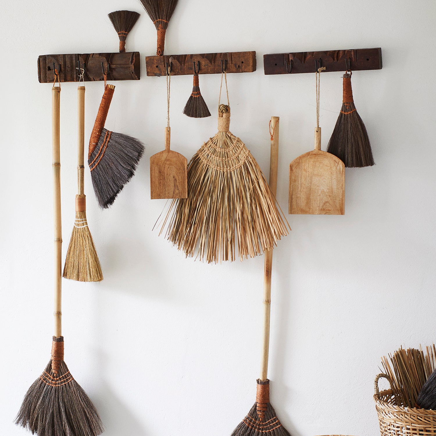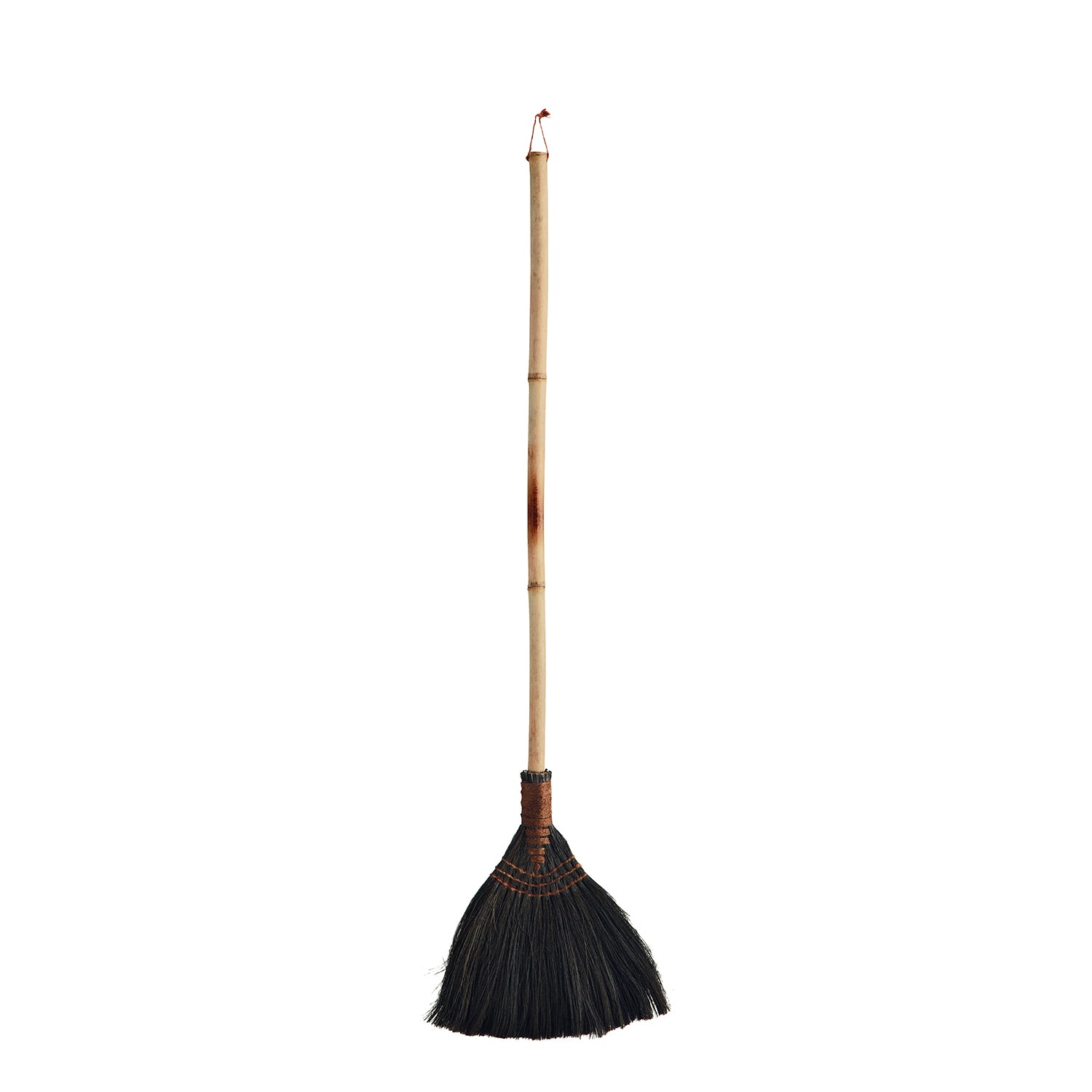 The broom features a long bamboo handle, perfect for sweeping uncarpeted floors.