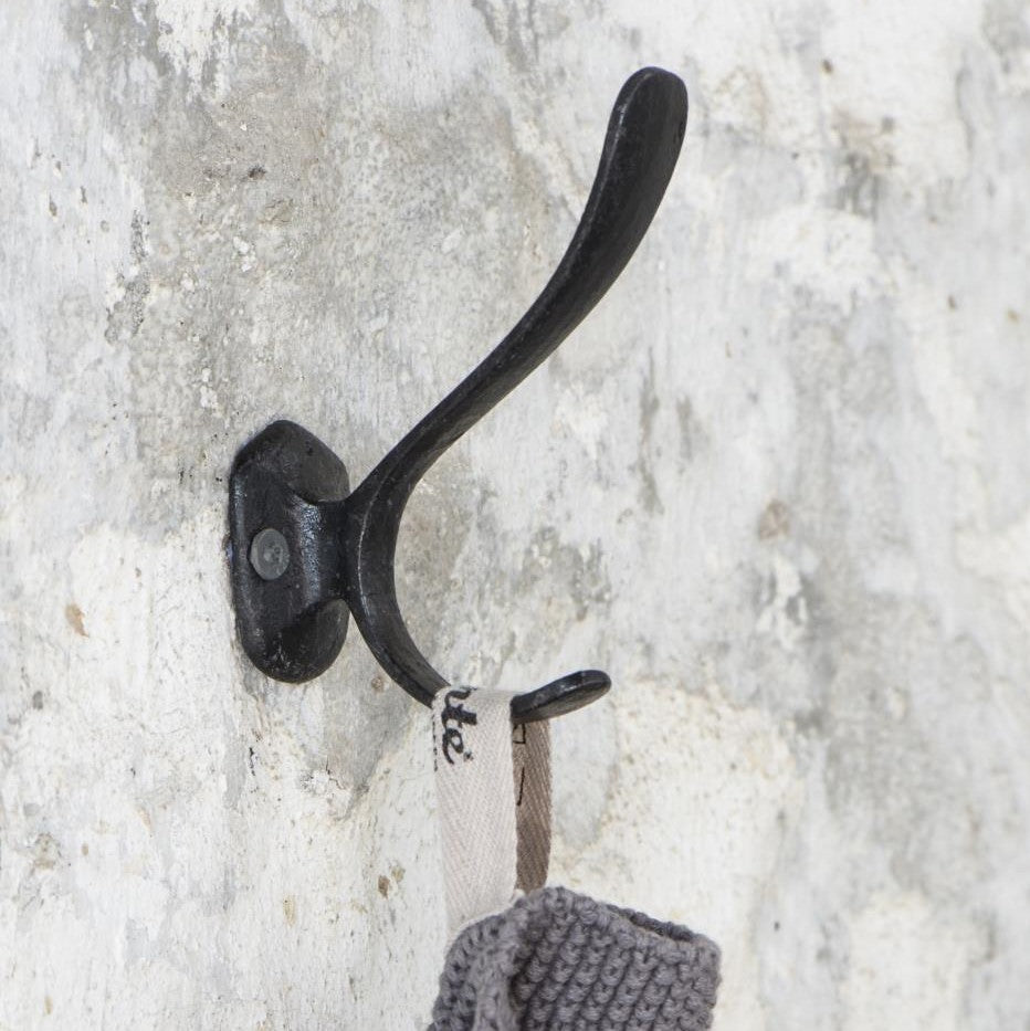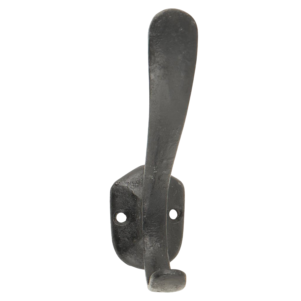 An elegant, country-style, metal hook in factory black.