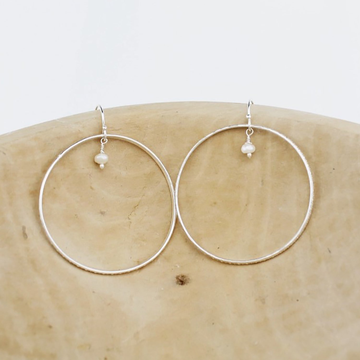 Handmade Sterling Silver Celestial Hoop Earrings featuring a tiny pearl bead. The edge of the hoop has been textured with a delicate pattern.