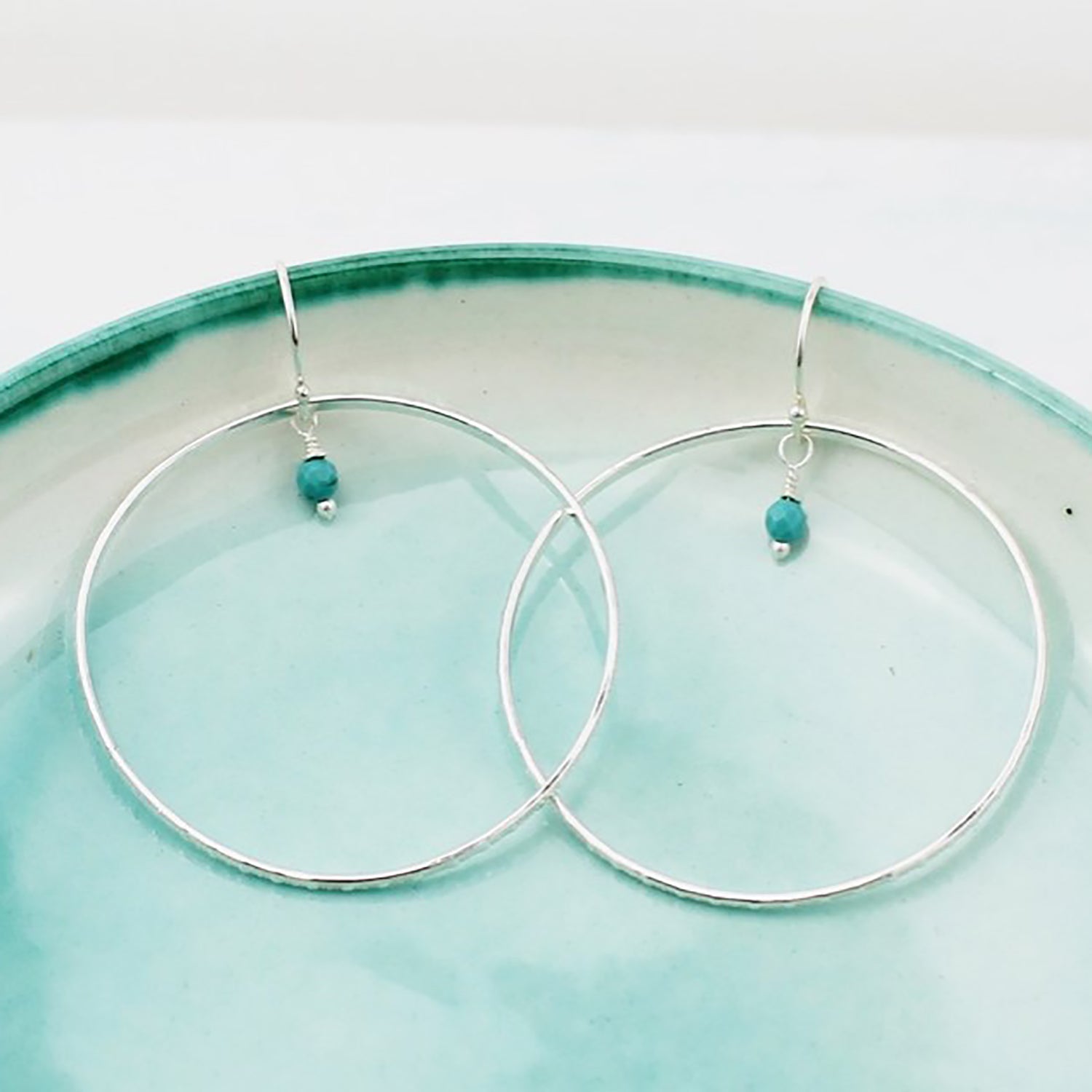 Handmade Sterling Silver Celestial Hoop Earrings featuring a tiny Turquoise bead. The edge of the hoop has been textured with a delicate pattern.