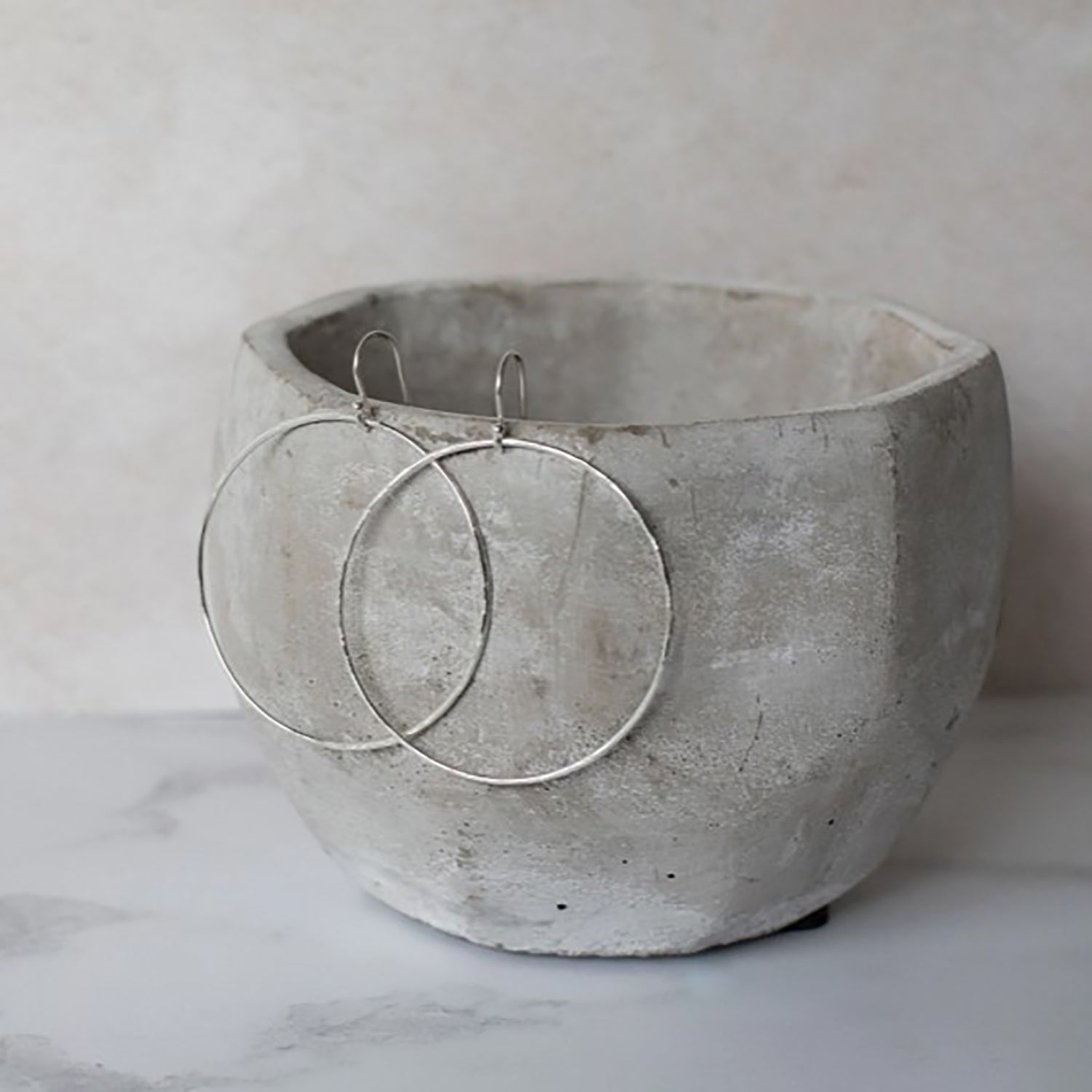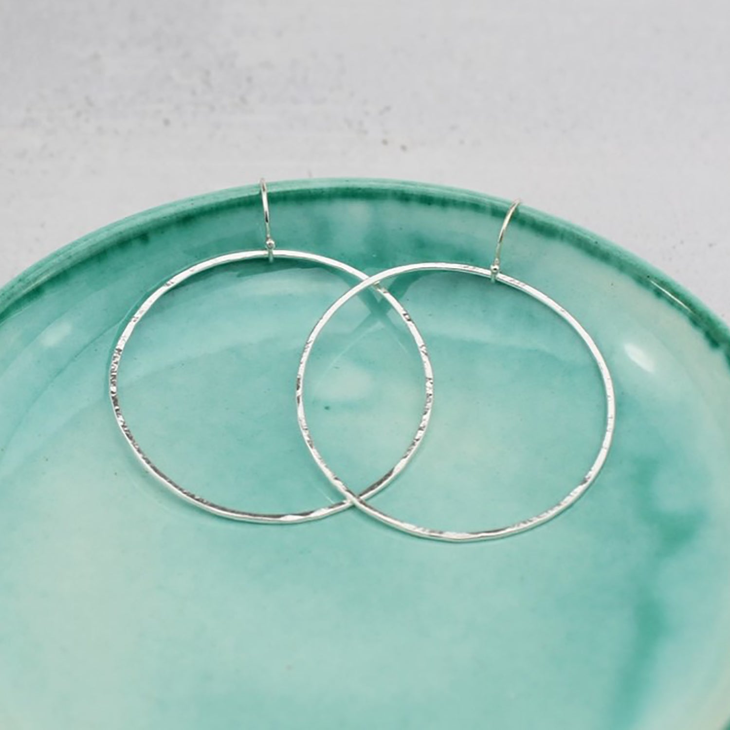 Each sterling silver circle charm measures approximately 4.5cm in diameter and hangs from a sterling silver ear wire making this hoop a brilliant everyday hoop earring.