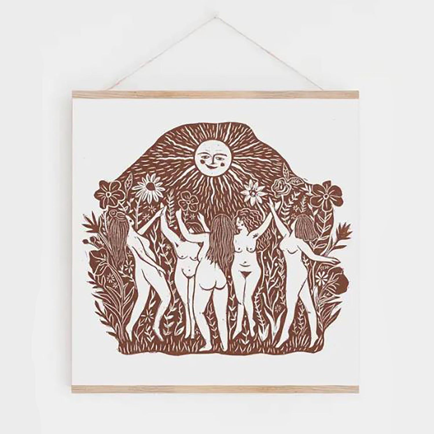 Handmade linocut print, printed on Lokta paper using oil-based relief ink. 4 women dance in the warmth of the sun, surrounded by springtime florals and plants. This is a playful print, exploring nature, paganism and inspired by medieval and historical engravings of old. Printed on finest handmade washi paper with oil-based ink. A limited edition run of 150.