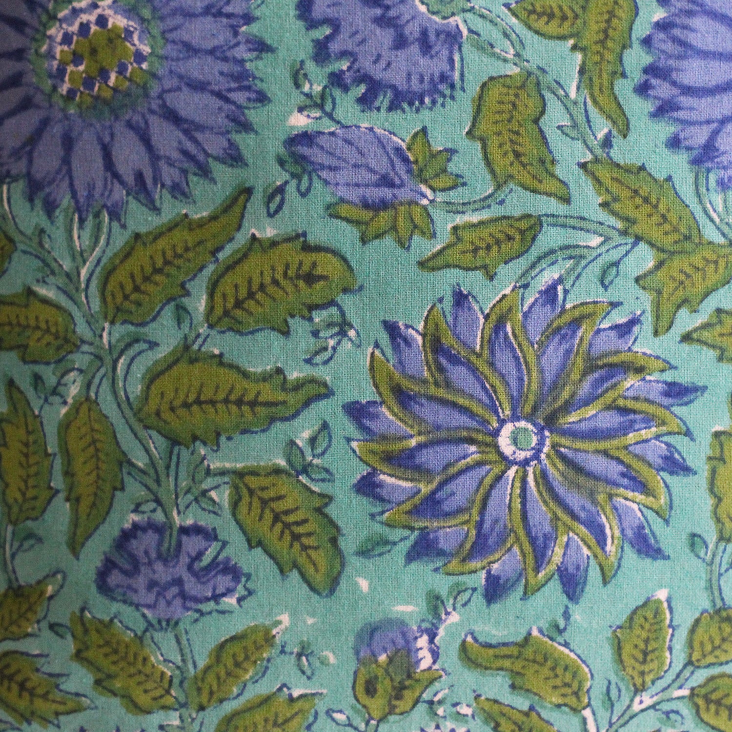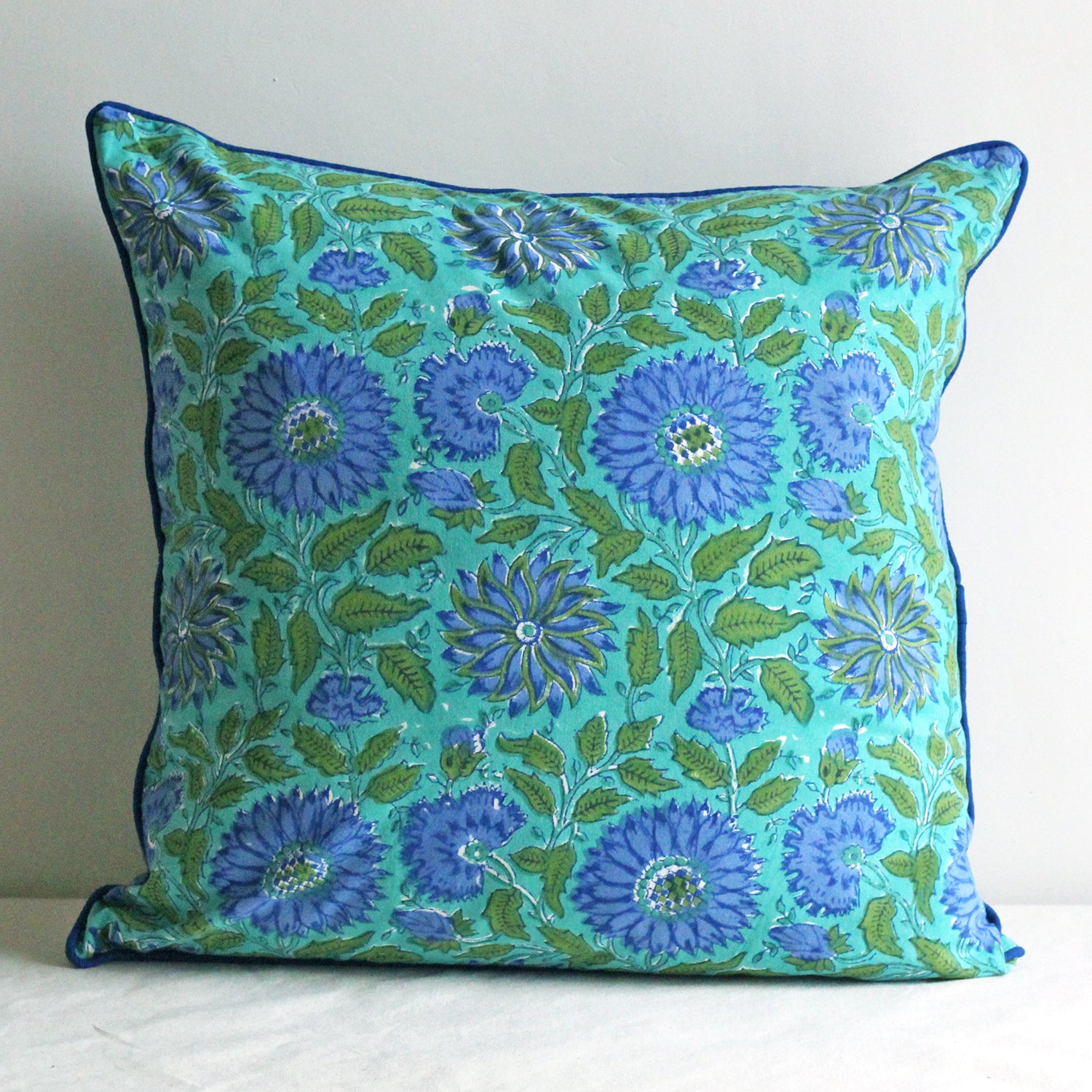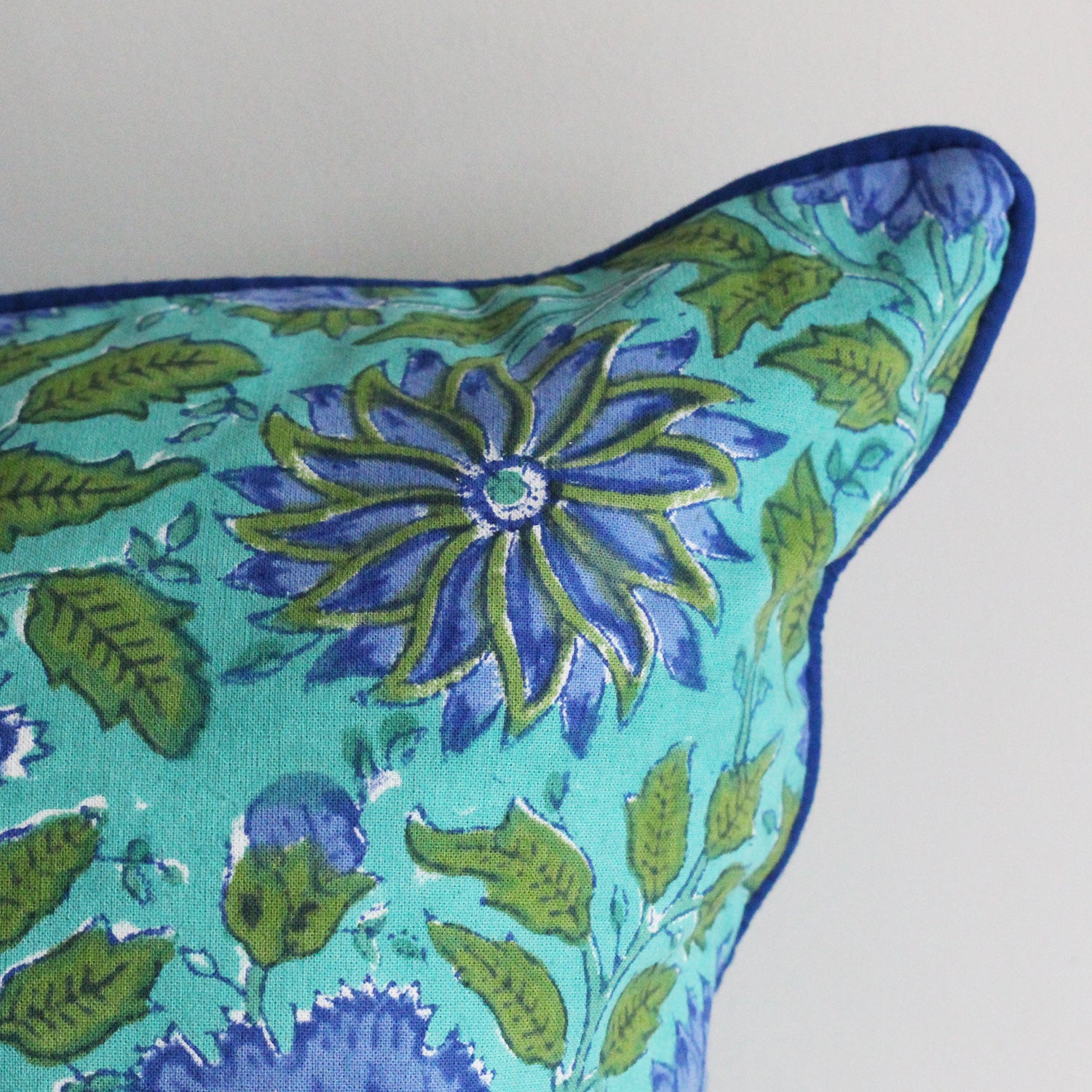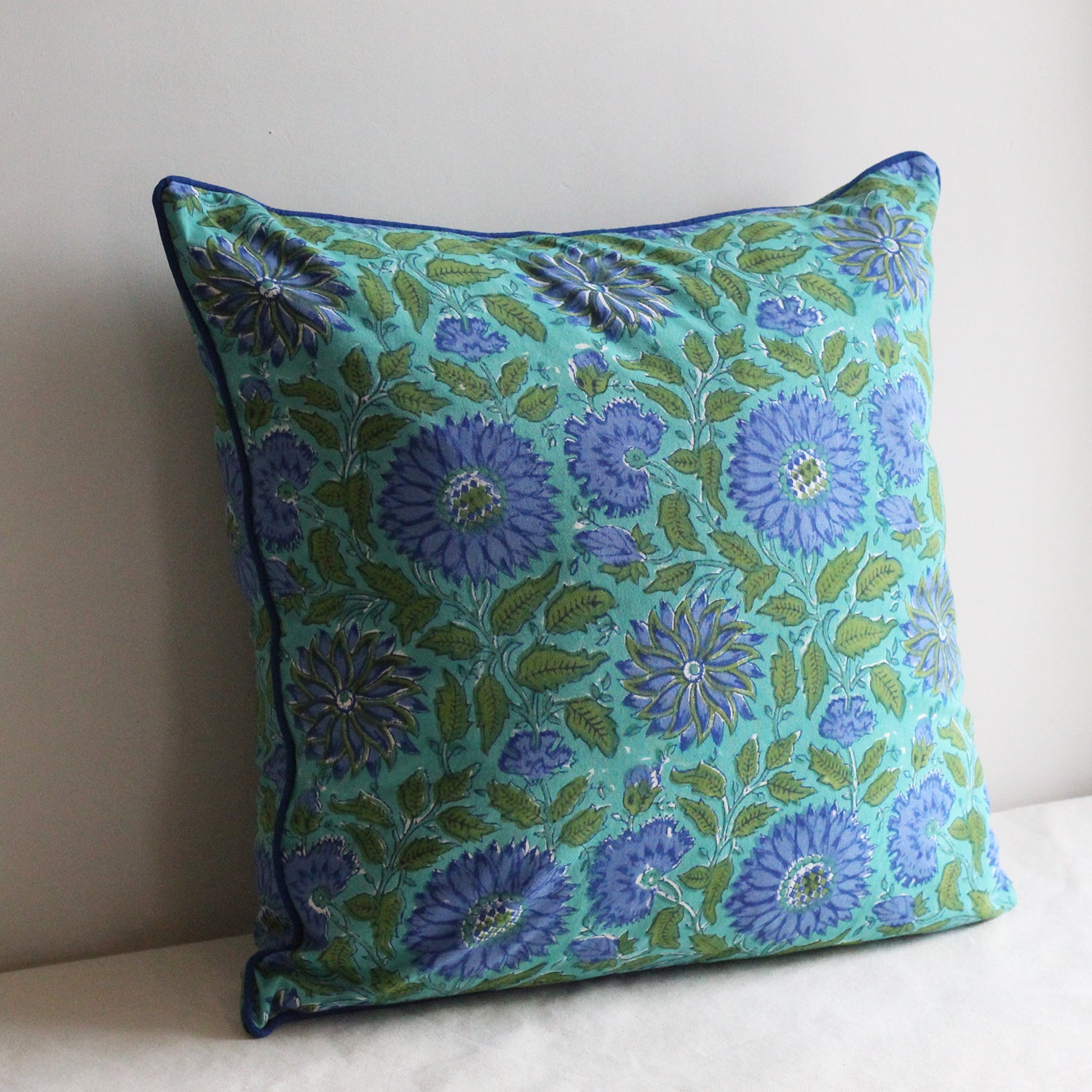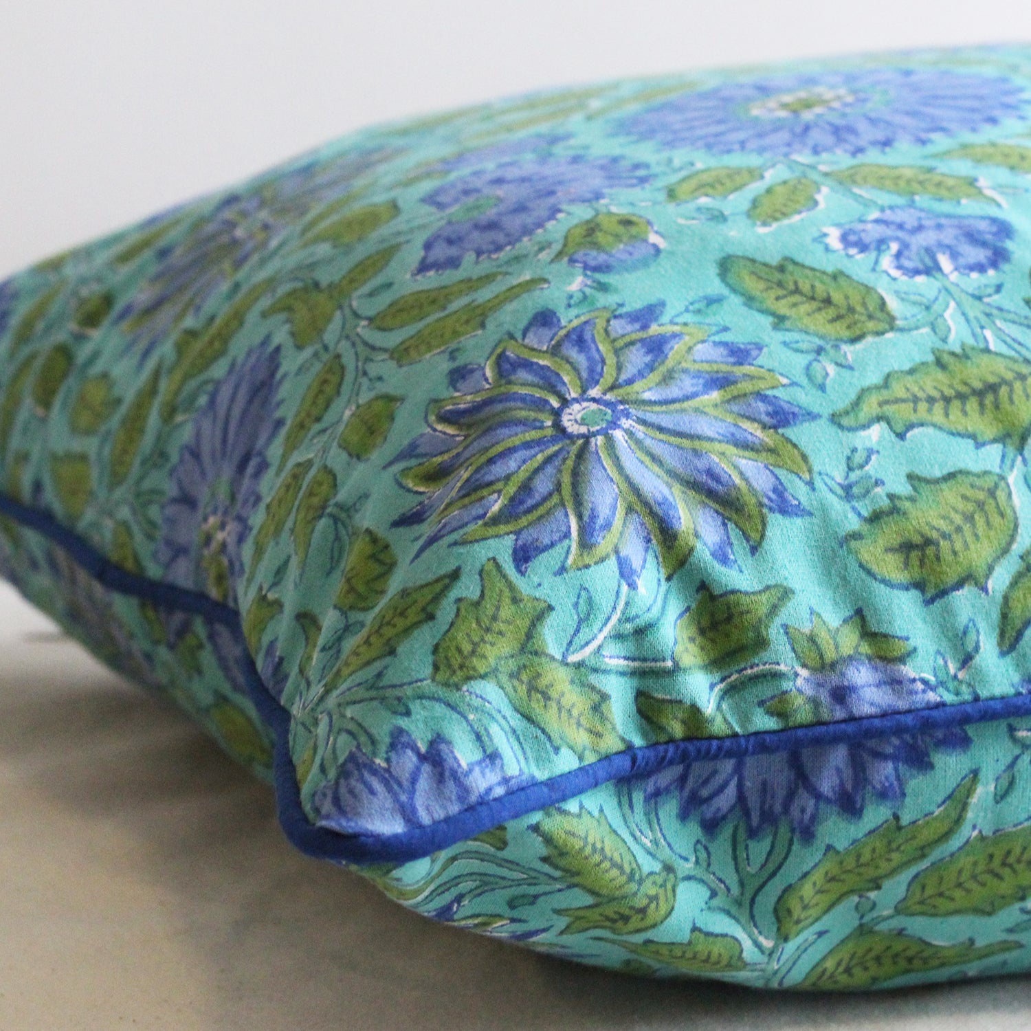 'Sunflower' Blue Block Print Cotton Cushion Cover with Piping, 50 x 50 cm