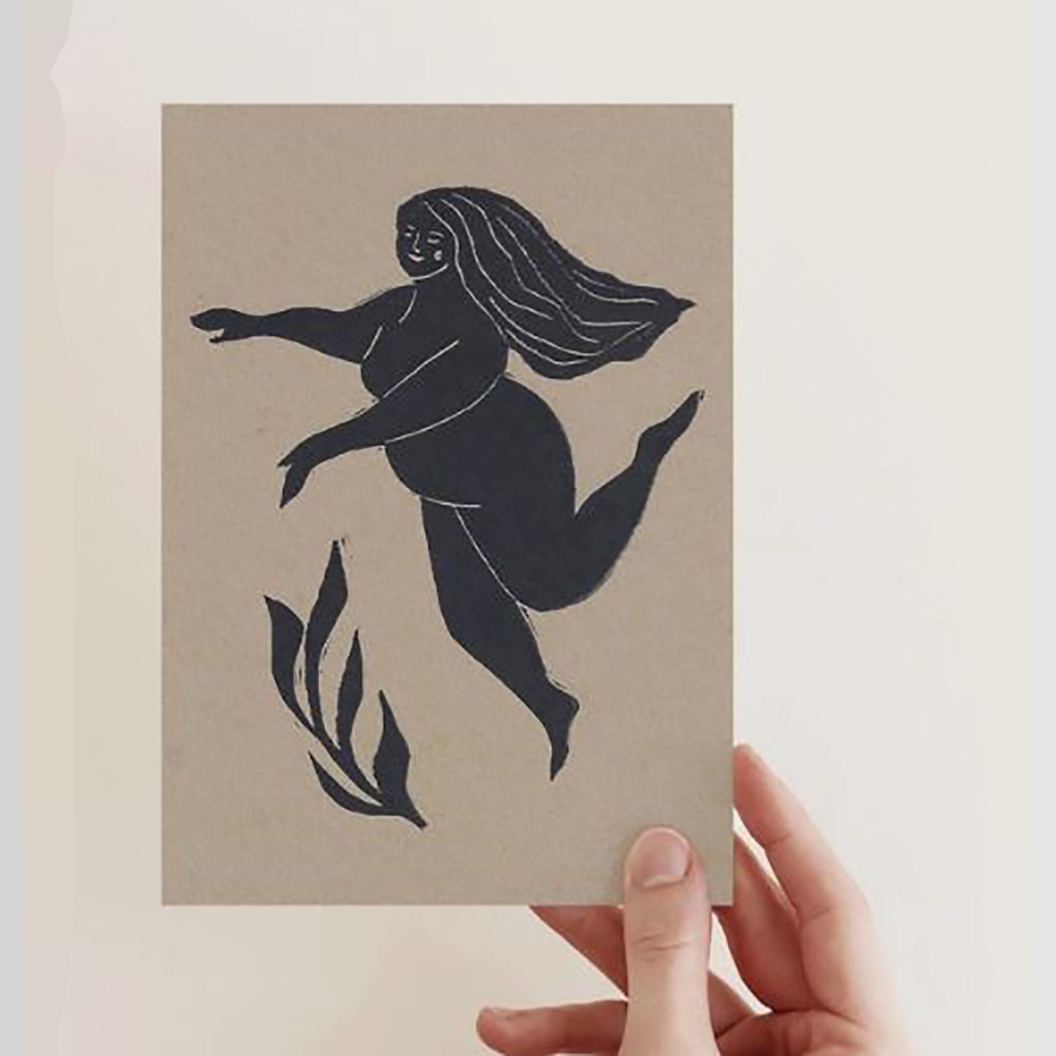 Handmade block print that celebrates womanhood and body positivity. Grey Blue ink on tonal postcard paper.