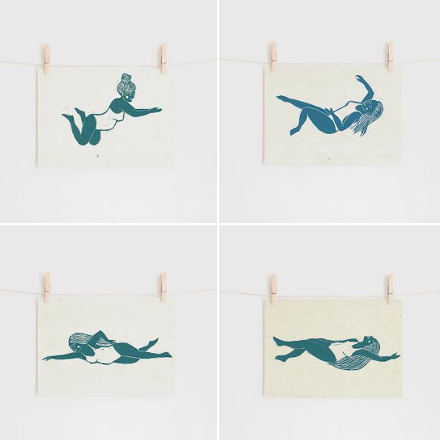 Handmade linocut print, printed on handmade papers using Caligo oil-based relief ink. Simple and striking mini prints depicting wild swimmers in different strokes. Printed on gorgeous hand made papers- Nepalese Lokta or Japanese Washi, in blues and jades.