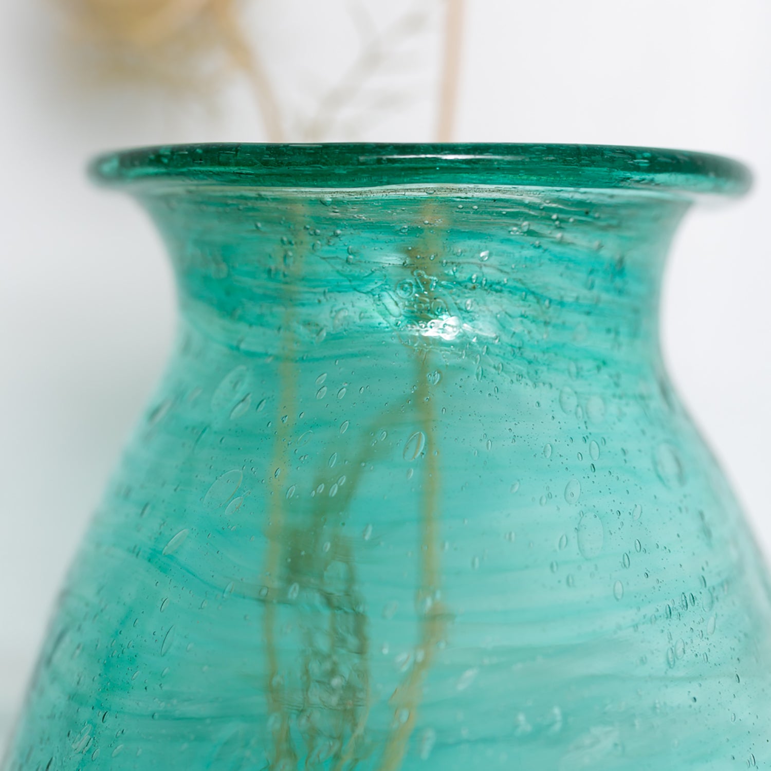 Adorn a side table or mantel piece with the beautiful Padma Vase from Grand Illusions, made entirely of recycled glass. Its teal tones means it will fit perfectly with a calm and serene aesthetic and provide a beautiful home for freshly picked flowers, all year round.