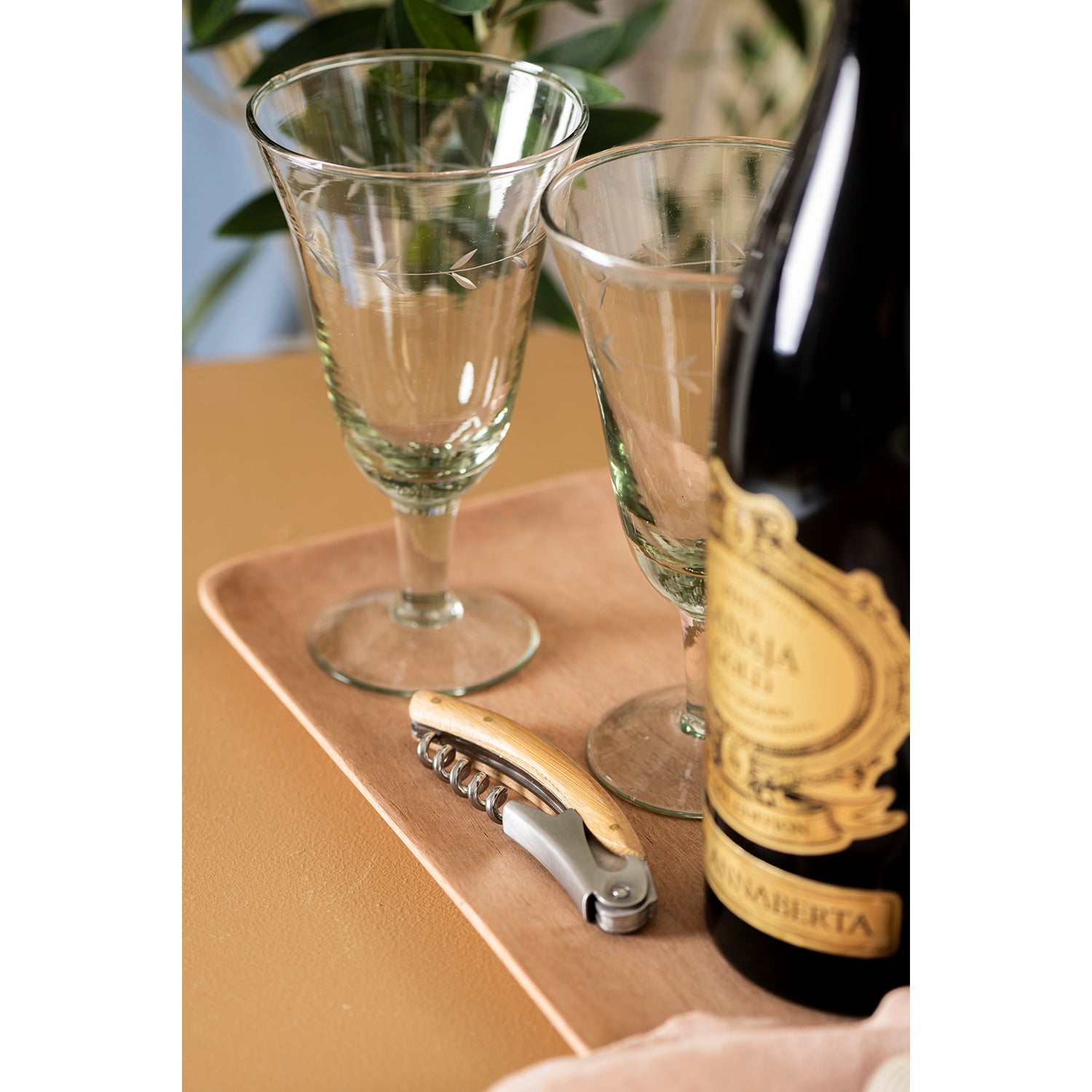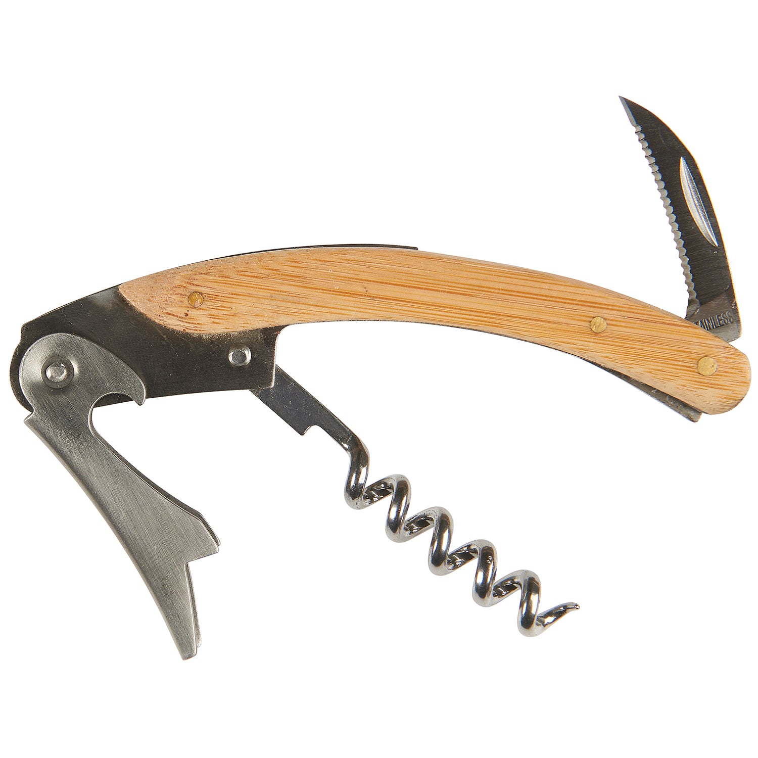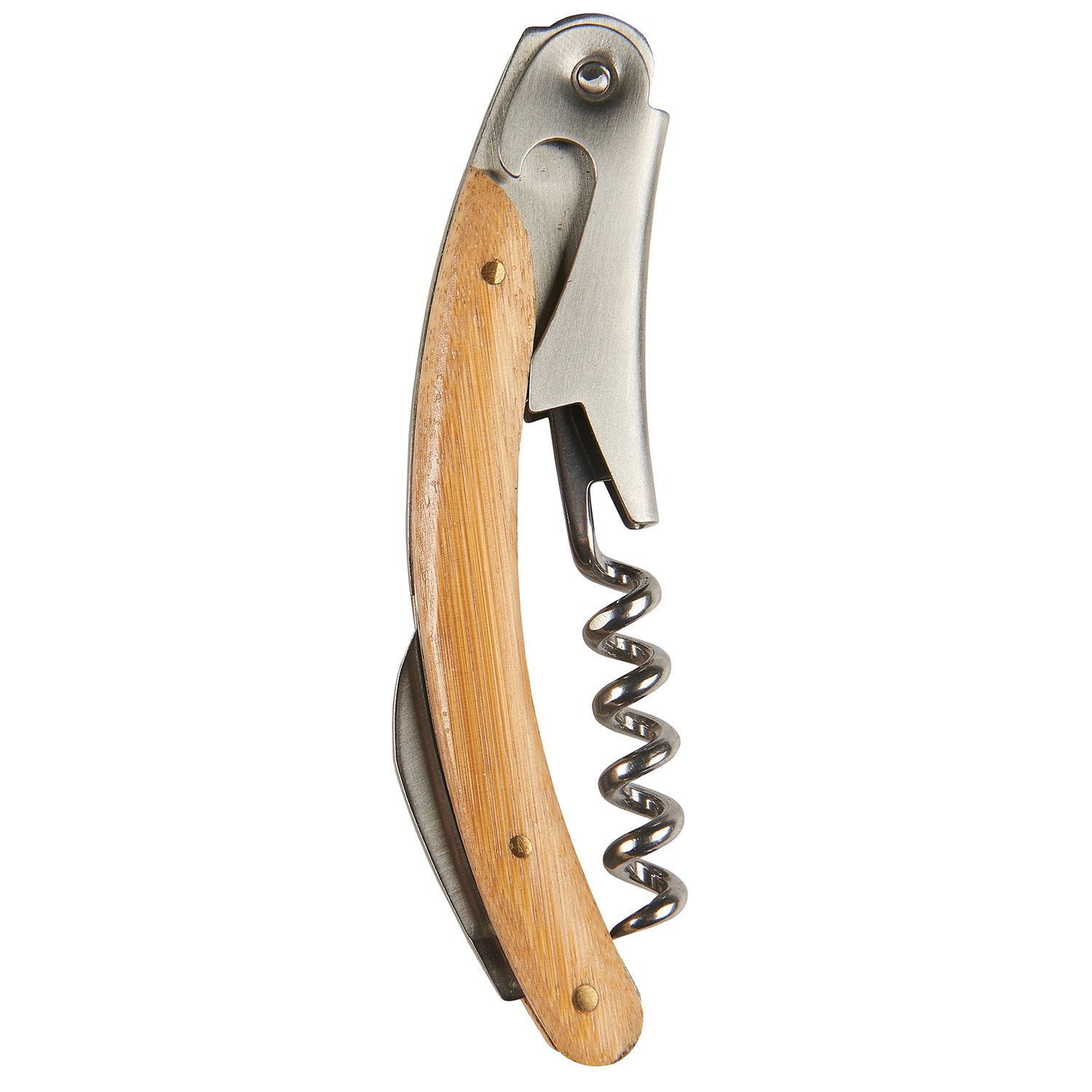 A corkscrew with a nice wooden handle, capable of opening wine and beer bottles.