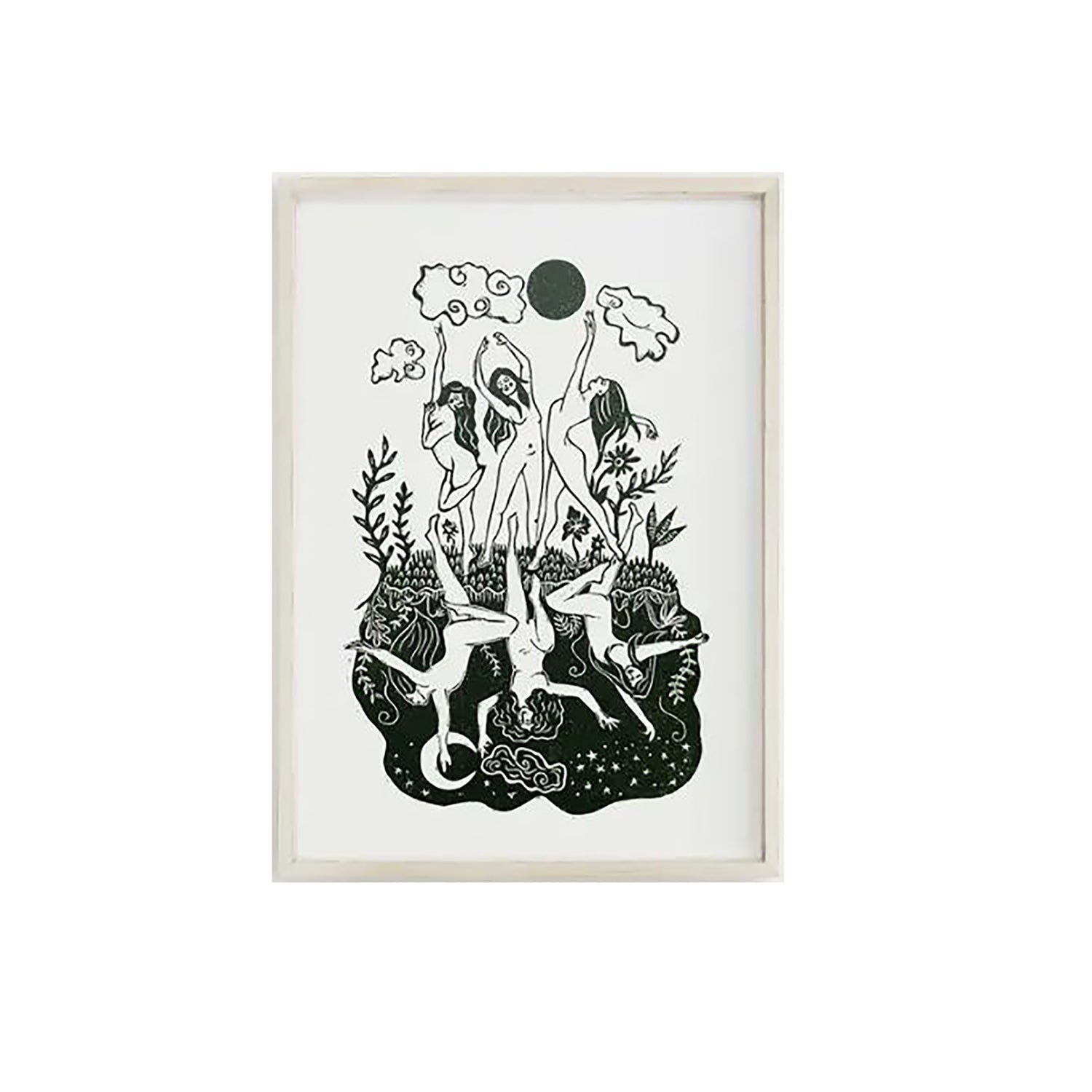 We Dance in the Dark, We Dance in the Light (Limited Edition). Handmade linocut print, printed on Japanese Ho Sho paper using Hawthorn oil-based relief ink in a dark sap green. This is a playful print, exploring the play on dark and light, nature, paganism, and inspired by medieval and historical engravings of old. Printed on finest handmade Japanese Washi paper with oil-based ink. A limited-edition run of 150.